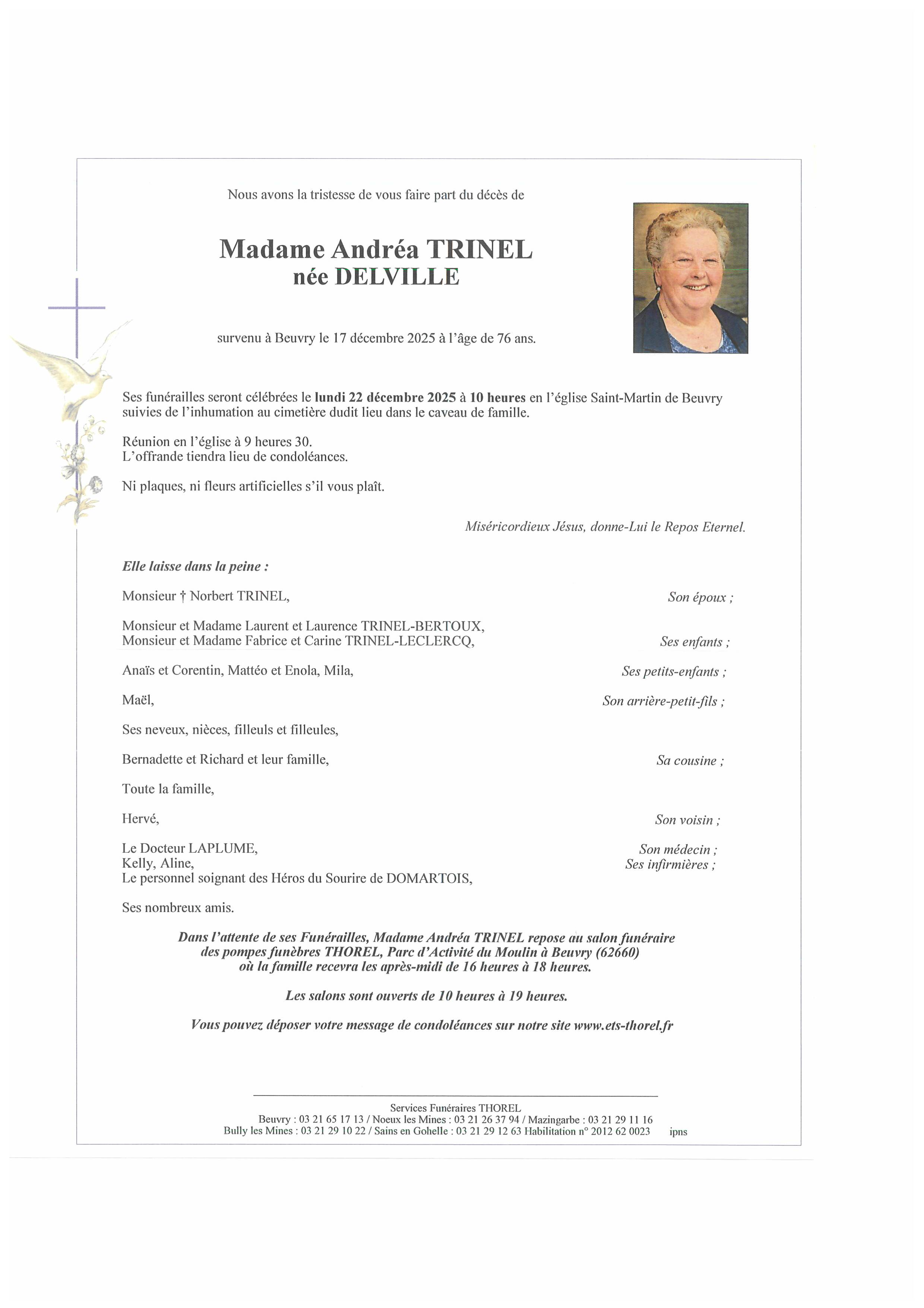 C’est avec une grande tristesse que nous vous annonçons le décès d’Andréa TRINEL survenu le mercredi 17 décembre 2025 à Beuvry. La cérémonie se déroulera le lundi 22 décembre 2025 à 10h00 à l’adresse suivante : .