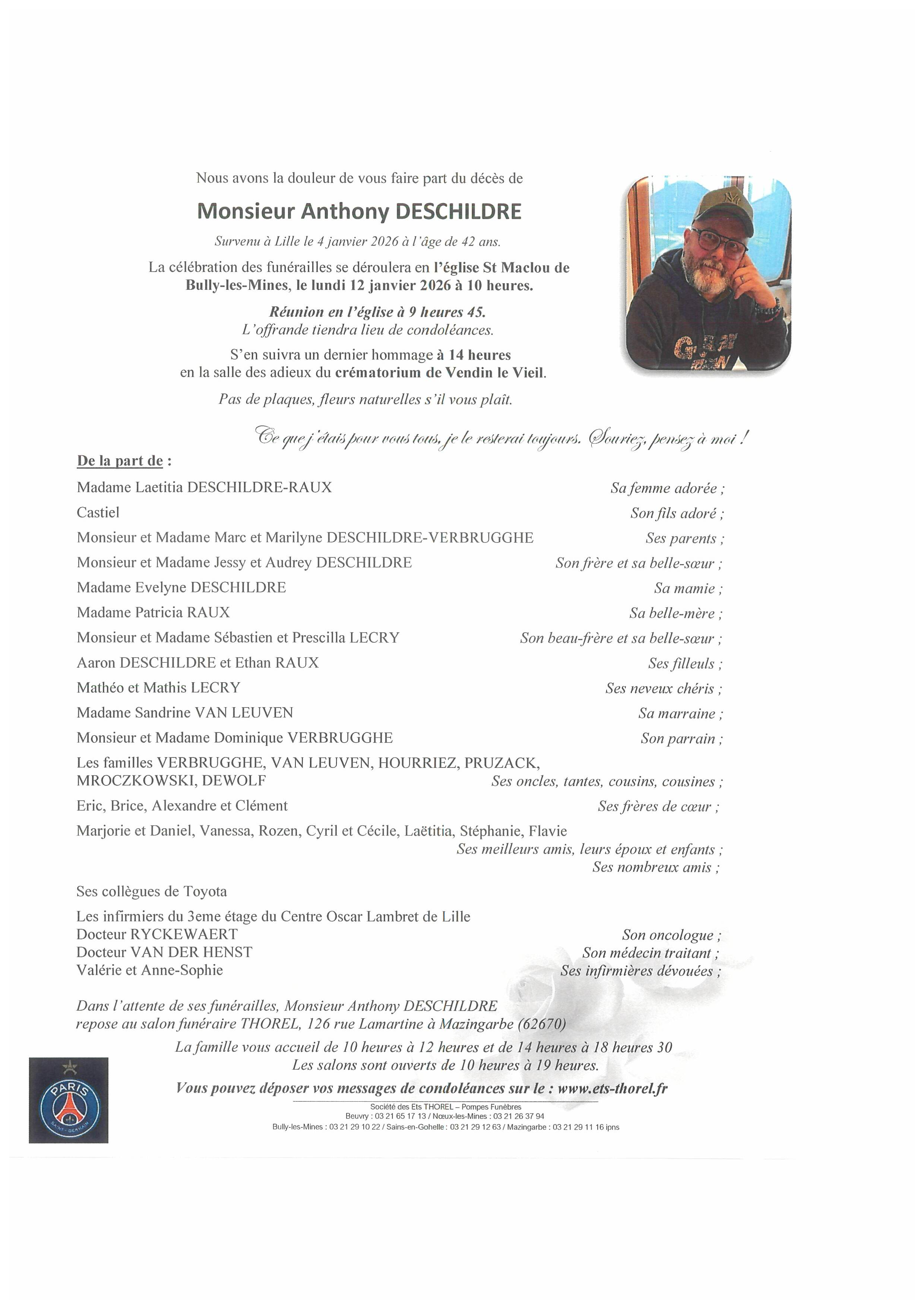 C’est avec une grande tristesse que nous vous annonçons le décès d’Anthony DESCHILDRE survenu le dimanche 04 janvier 2026 à Lille. La cérémonie se déroulera le lundi 12 janvier 2026 à 10h00 à l’adresse suivante : Église Saint Maclou - 11 Rue Ernest Renan - 62160 Bully-les-Mines.