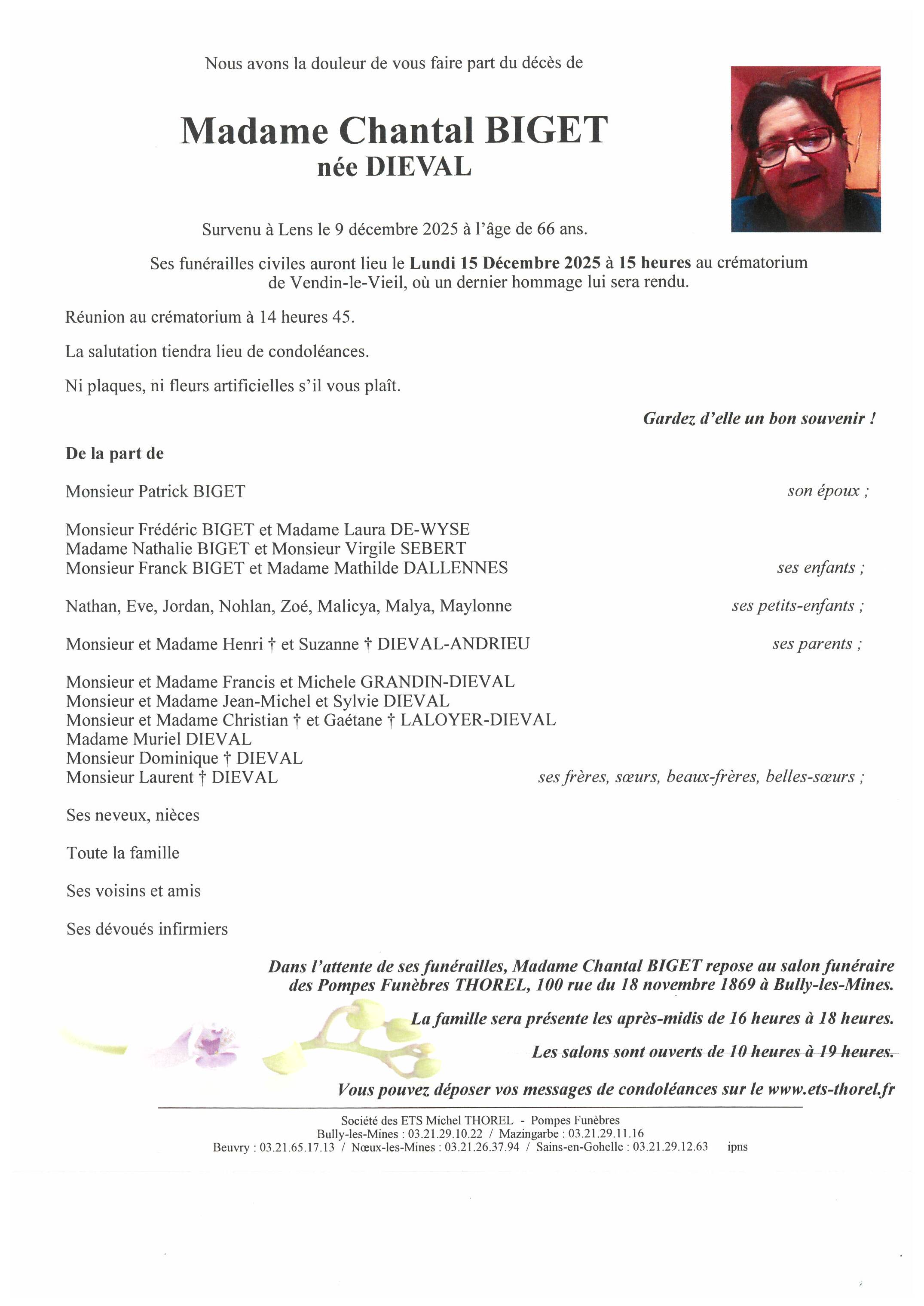 C’est avec une grande tristesse que nous vous annonçons le décès de Chantal BIGET survenu le mardi 09 décembre 2025 à Lens. La cérémonie se déroulera le lundi 15 décembre 2025 à 15h00 à l’adresse suivante : Crématorium de Vendin le Vieil - Route de la Bassée - 62880 Vendin-le-Vieil.
