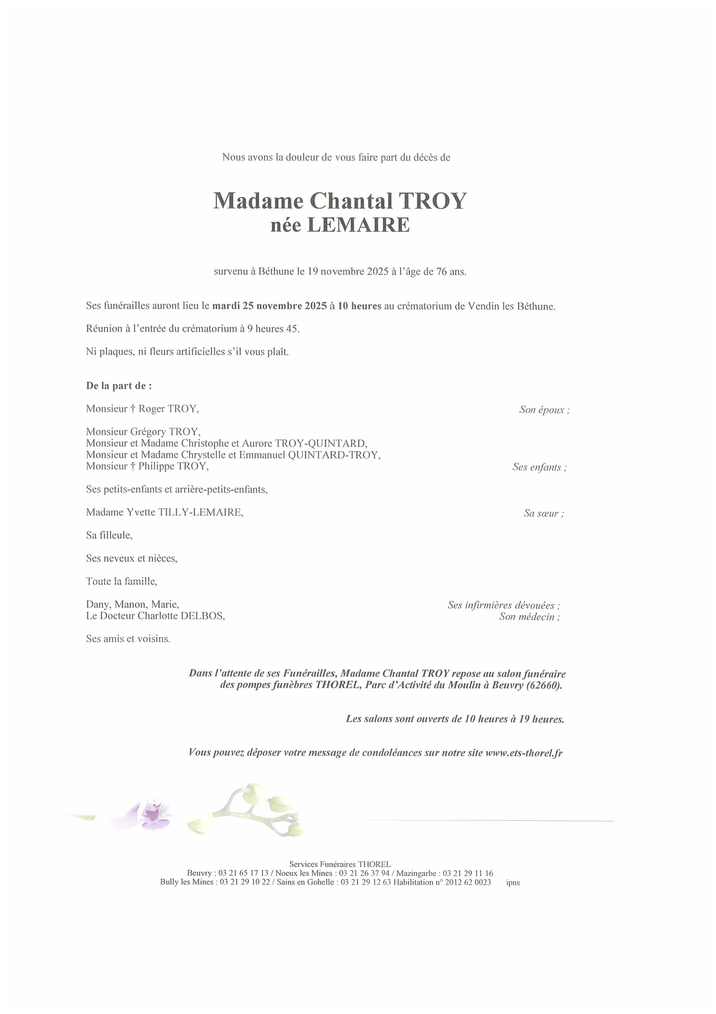 C’est avec une grande tristesse que nous vous annonçons le décès de Chantal TROY survenu le mercredi 19 novembre 2025 à Béthune. La cérémonie se déroulera le mardi 25 novembre 2025 à 10h00 à l’adresse suivante : Crématorium de Vendin les Bethune - Route de Saint-Venant - 62232 Vendin-lès-Béthune.