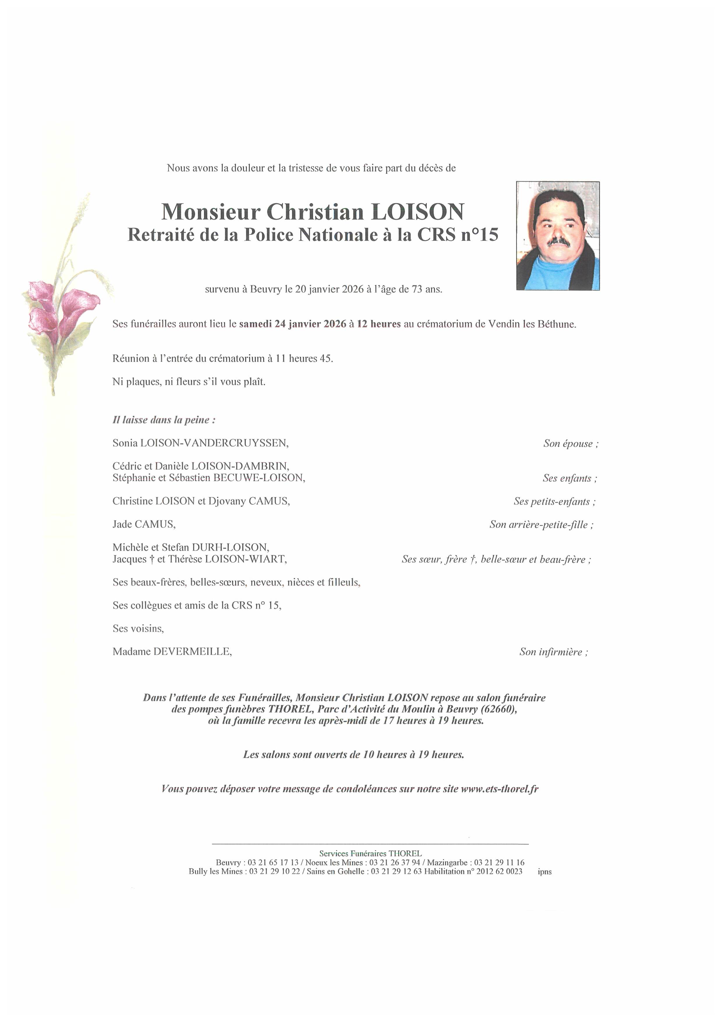 C’est avec une grande tristesse que nous vous annonçons le décès de Christian LOISON survenu le mardi 20 janvier 2026 à Beuvry. La cérémonie se déroulera le samedi 24 janvier 2026 à 12h00 à l’adresse suivante : Crématorium de Vendin les Bethune - Route de Saint-Venant - 62232 Vendin-lès-Béthune.