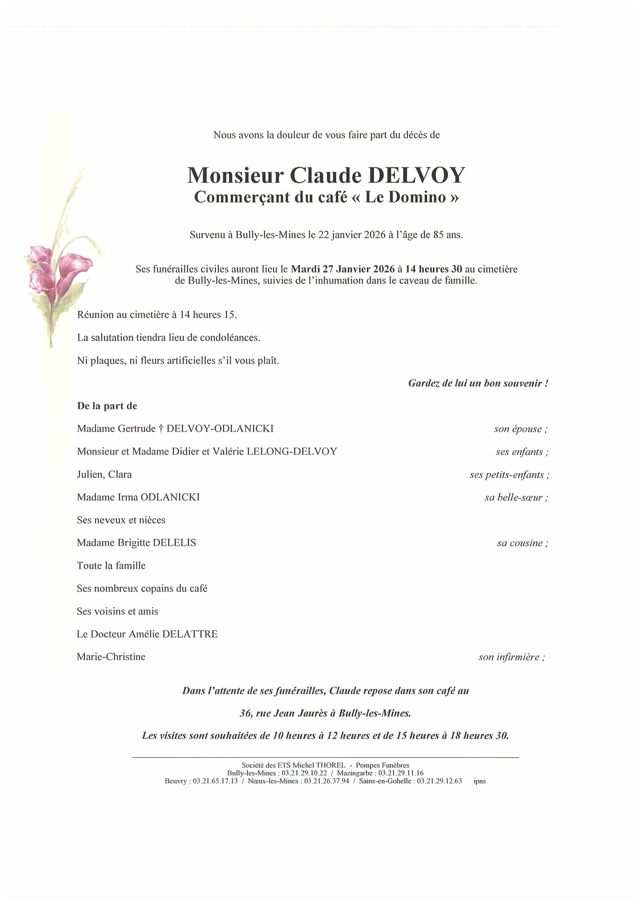 C’est avec une grande tristesse que nous vous annonçons le décès de Claude DELVOY survenu le jeudi 22 janvier 2026 à Bully-les-Mines. La cérémonie se déroulera le mardi 27 janvier 2026 à 14h15 à l’adresse suivante : Cimetière - 62160 Bully-les-Mines.