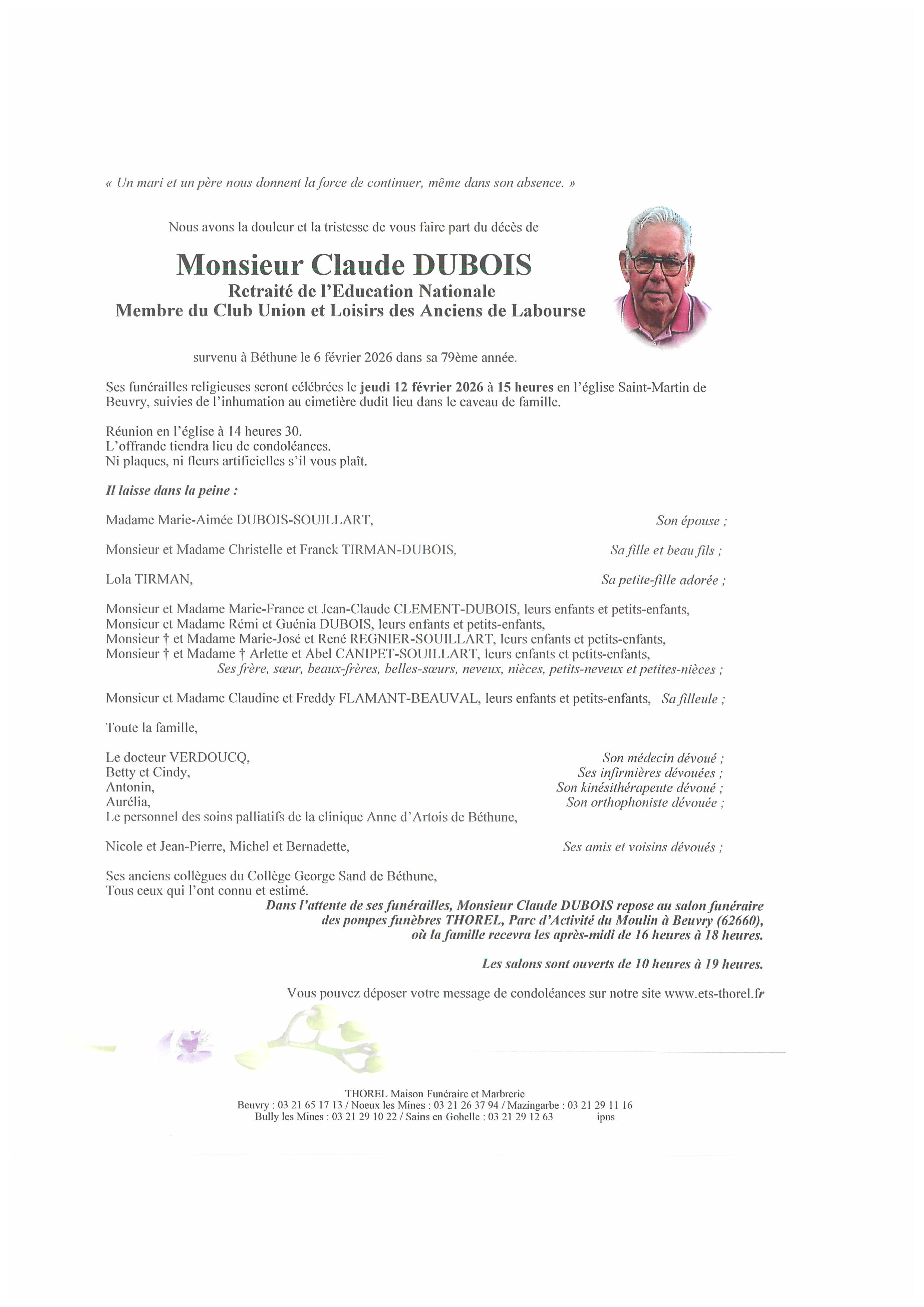 C’est avec une grande tristesse que nous vous annonçons le décès de Claude DUBOIS survenu le vendredi 06 février 2026 à Béthune. La cérémonie se déroulera le jeudi 12 février 2026 à 15h00 à l’adresse suivante : Église Saint Martin - Rue Sadi Carnot - 62660 Beuvry.