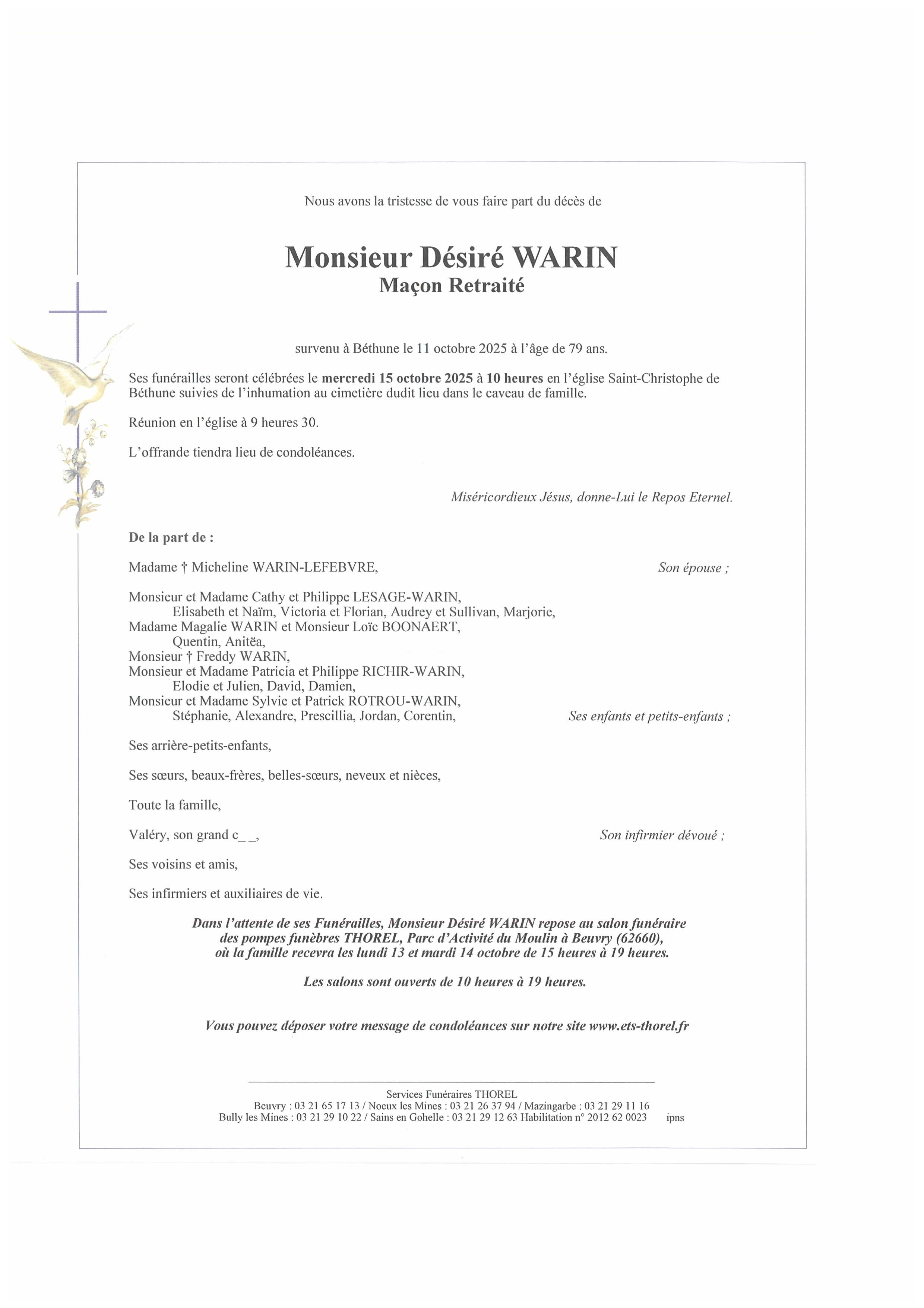 C’est avec une grande tristesse que nous vous annonçons le décès de Désiré WARIN survenu le samedi 11 octobre 2025 à Béthune. La cérémonie se déroulera le mercredi 15 octobre 2025 à 10h00 à l’adresse suivante : Église Saint Christophe - Rue Saint-Christophe Béthune - 62400 Béthune.