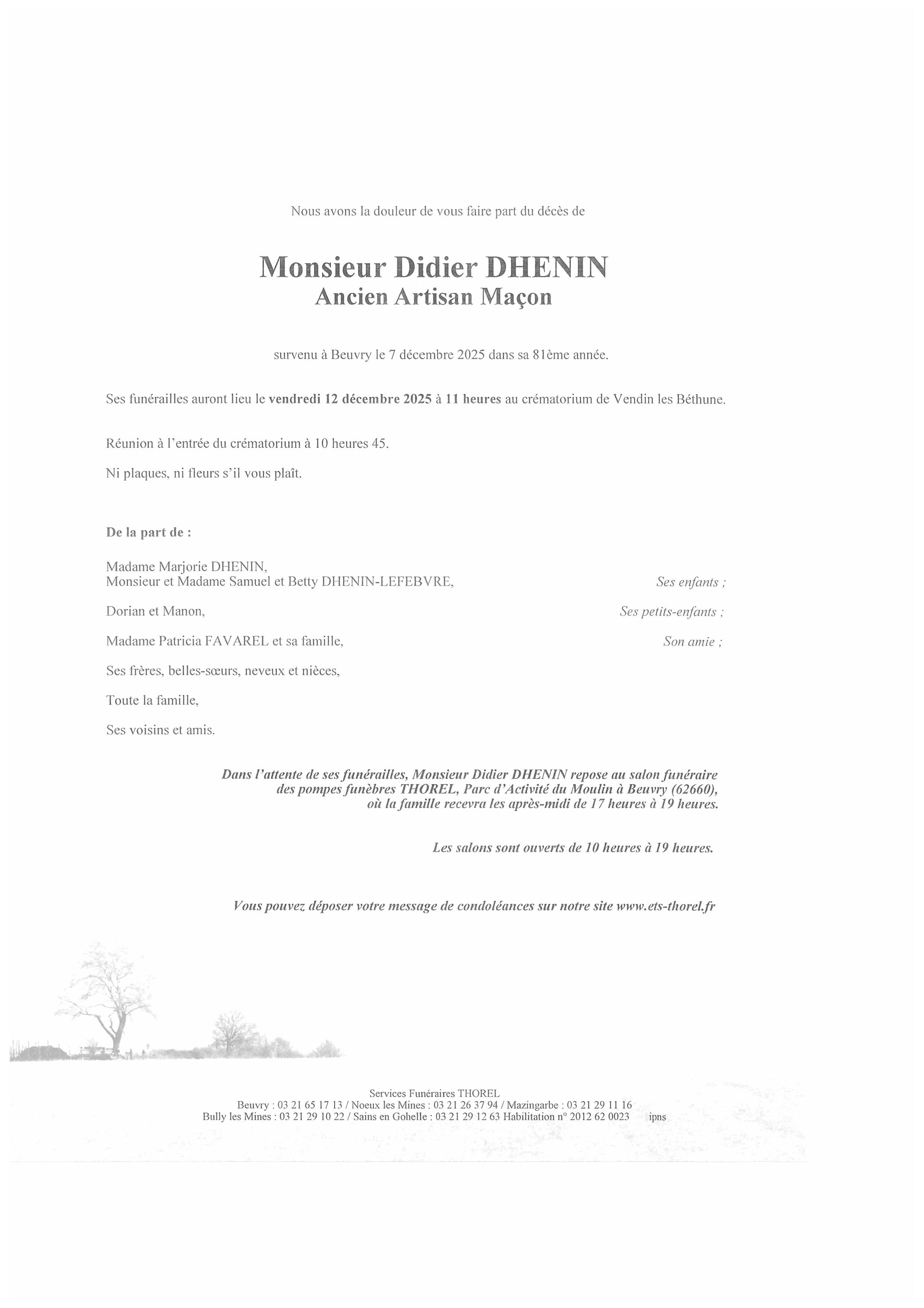C’est avec une grande tristesse que nous vous annonçons le décès de Didier DHENIN survenu le dimanche 07 décembre 2025 à Beuvry. La cérémonie se déroulera le vendredi 12 décembre 2025 à 11h00 à l’adresse suivante : Crématorium de Vendin les Bethune - Route de Saint-Venant - 62232 Vendin-lès-Béthune.