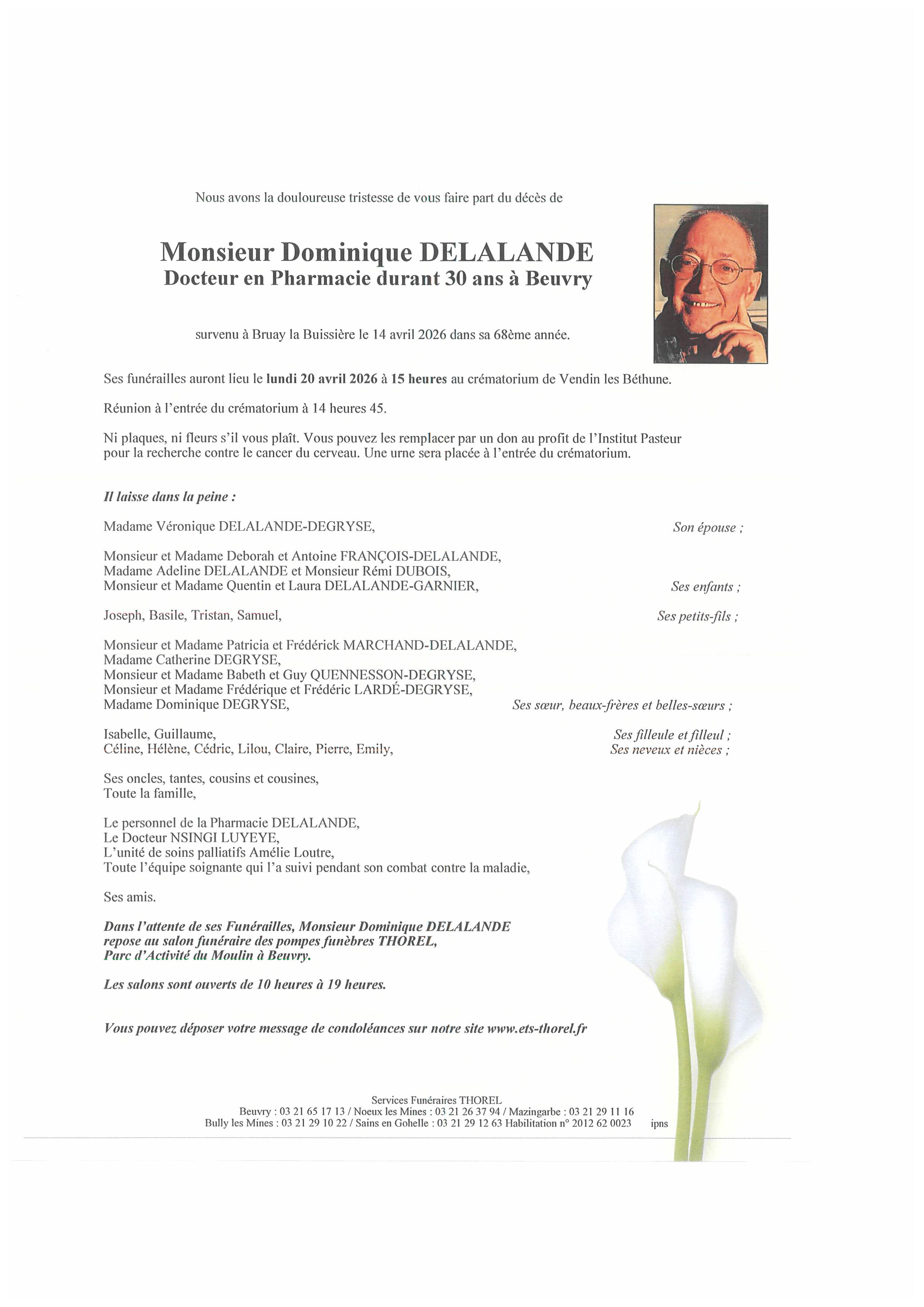 C’est avec une grande tristesse que nous vous annonçons le décès de Dominique DELALANDE survenu le mardi 14 avril 2026 à Bruay-la-Buissière. La cérémonie se déroulera le lundi 20 avril 2026 à 15h00 à l’adresse suivante : Crématorium de Vendin les Bethune - Route de Saint-Venant - 62232 Vendin-lès-Béthune.