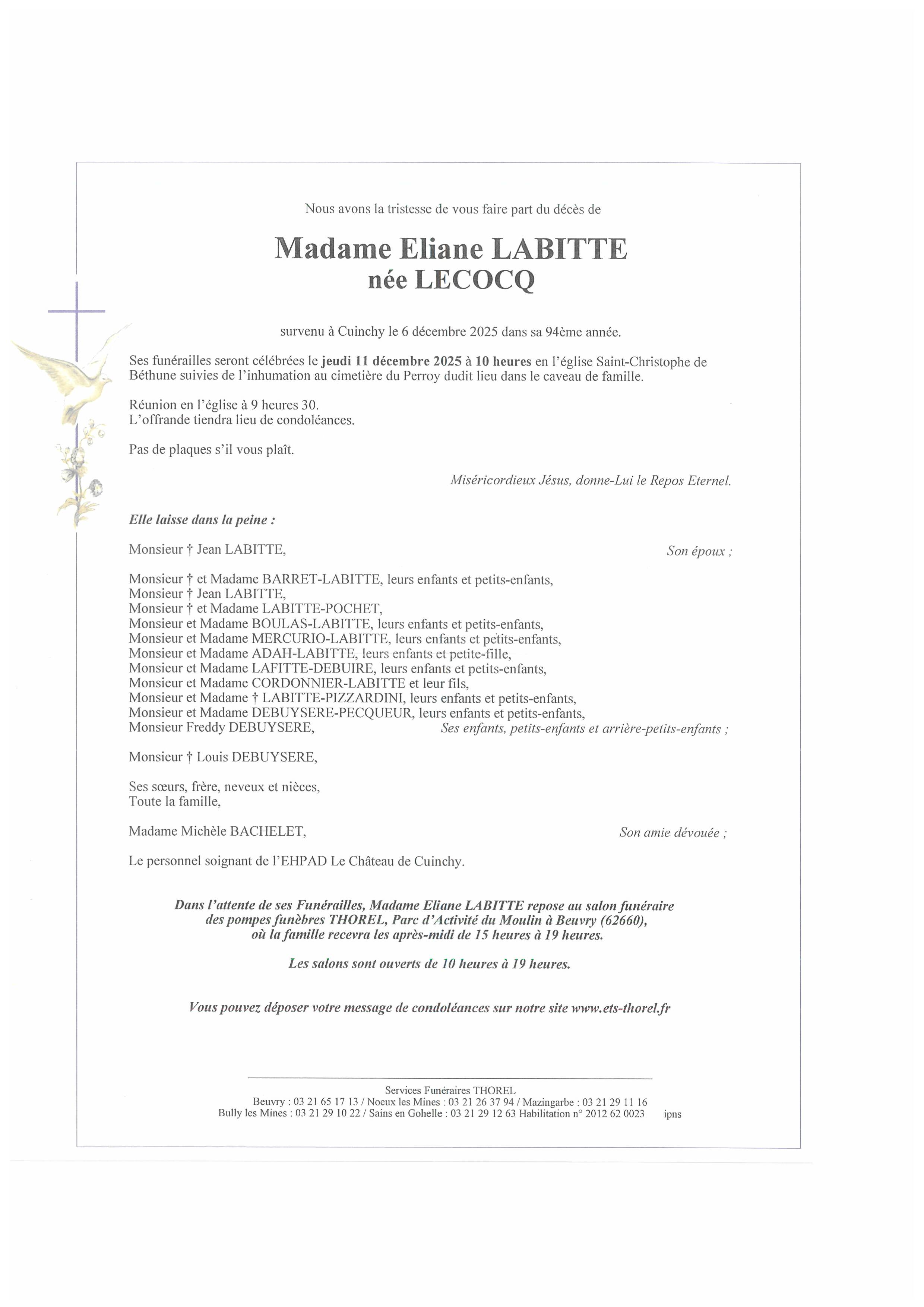 C’est avec une grande tristesse que nous vous annonçons le décès d’Eliane LABITTE survenu le samedi 06 décembre 2025 à Cuinchy. La cérémonie se déroulera le jeudi 11 décembre 2025 à 10h00 à l’adresse suivante : Église Saint Christophe - Rue Saint-Christophe Béthune - 62400 Béthune.