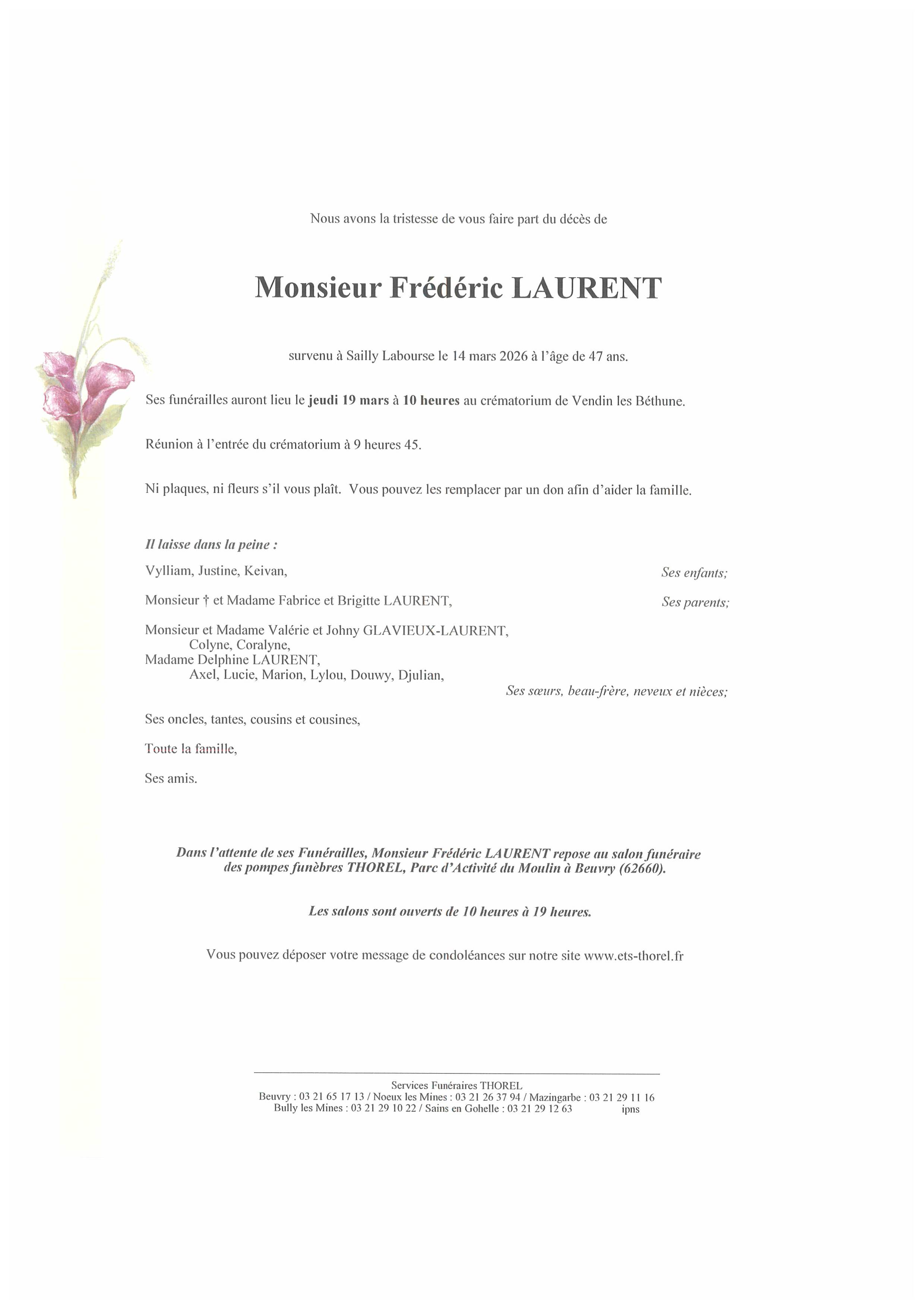 C’est avec une grande tristesse que nous vous annonçons le décès de Frédéric LAURENT survenu le samedi 14 mars 2026 à Sailly Labourse.