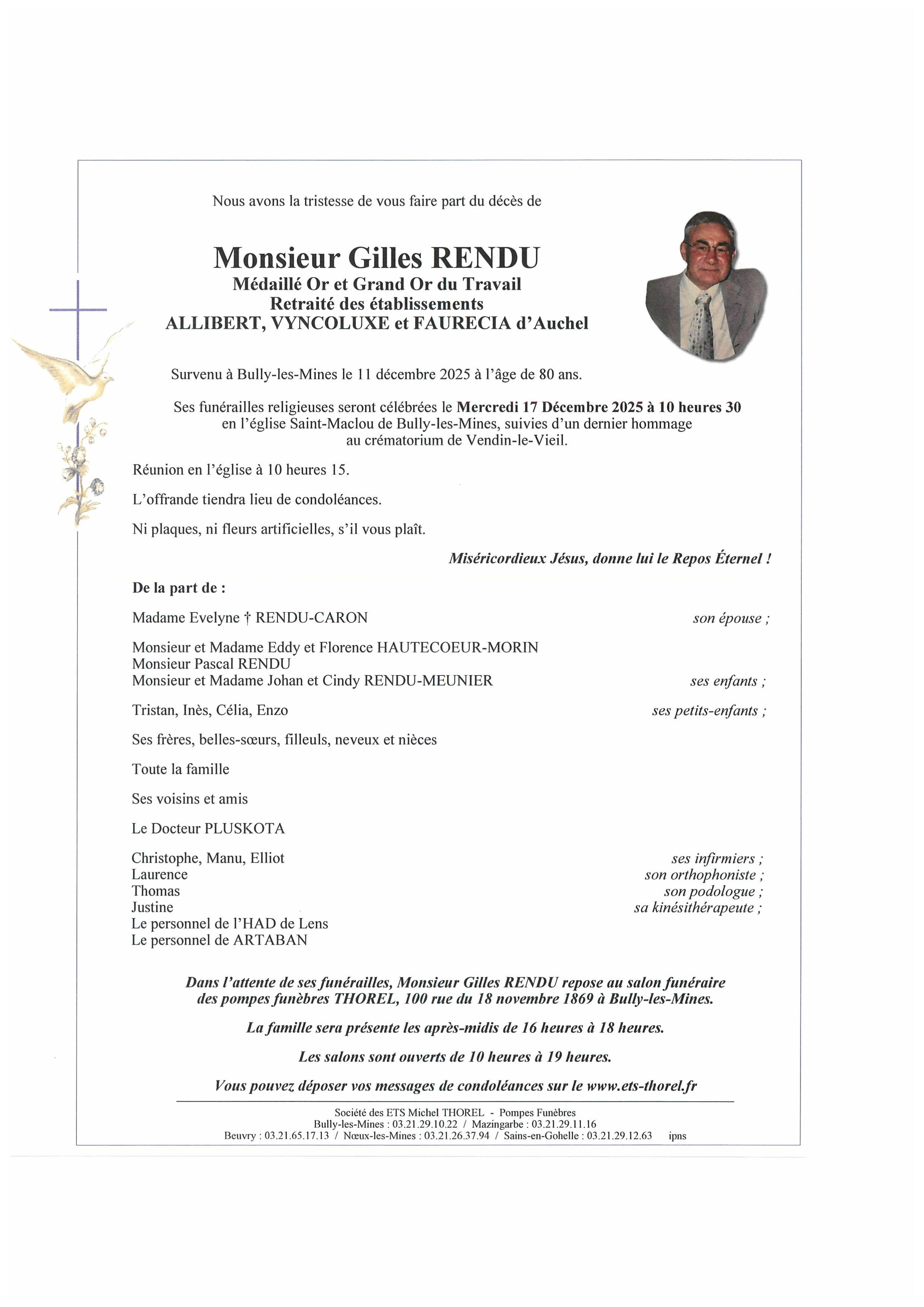 C’est avec une grande tristesse que nous vous annonçons le décès de Gilles RENDU survenu le jeudi 11 décembre 2025 à Bully-les-Mines. La cérémonie se déroulera le mercredi 17 décembre 2025 à 10h30 à l’adresse suivante : Église Saint Maclou - 11 Rue Ernest Renan - 62160 Bully-les-Mines.