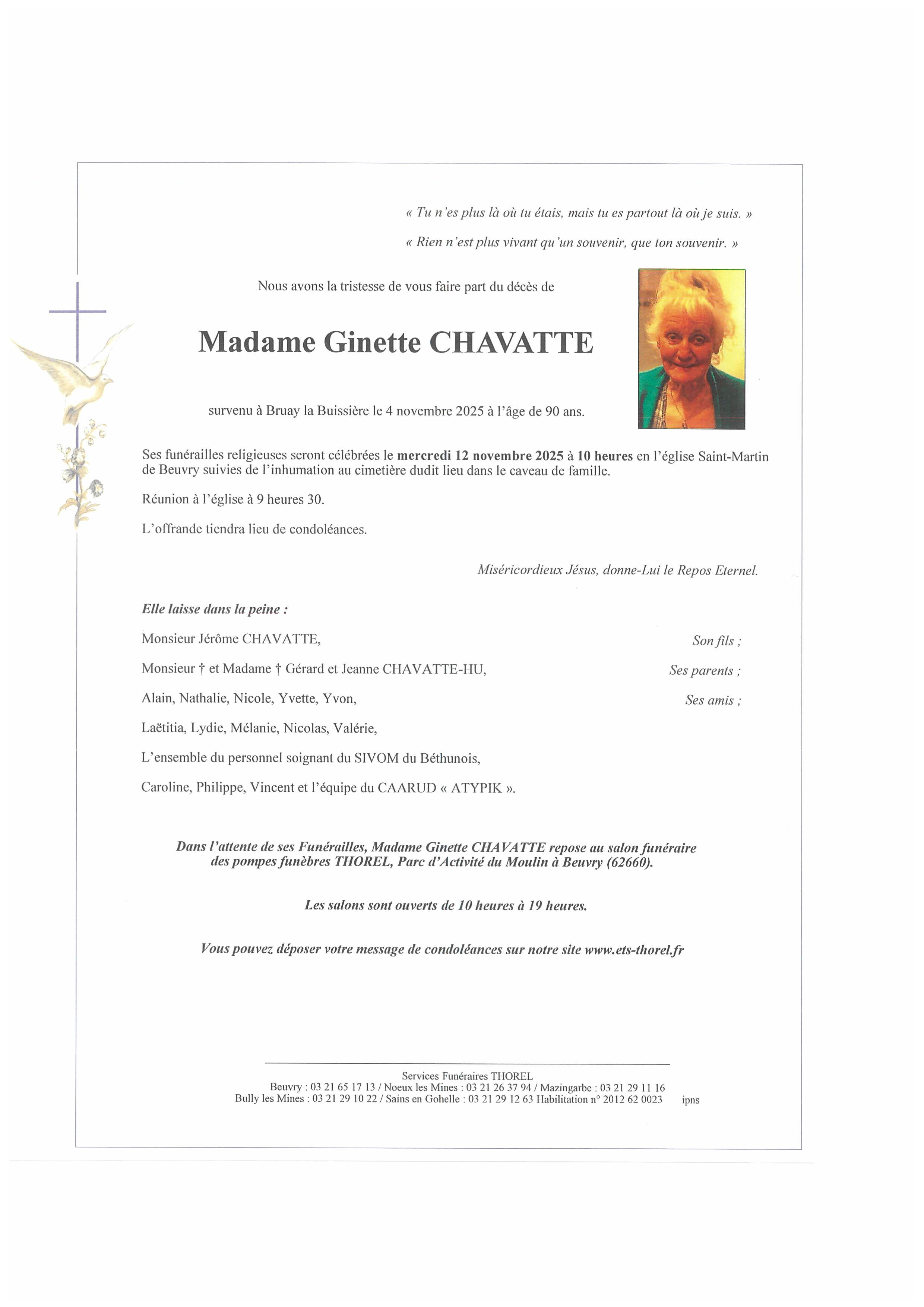 C’est avec une grande tristesse que nous vous annonçons le décès de Ginette CHAVATTE survenu le mardi 04 novembre 2025 à Bruay-la-Buissière. La cérémonie se déroulera le mercredi 12 novembre 2025 à 10h00 à l’adresse suivante : Église Saint Martin - Rue Sadi Carnot - 62660 Beuvry.
