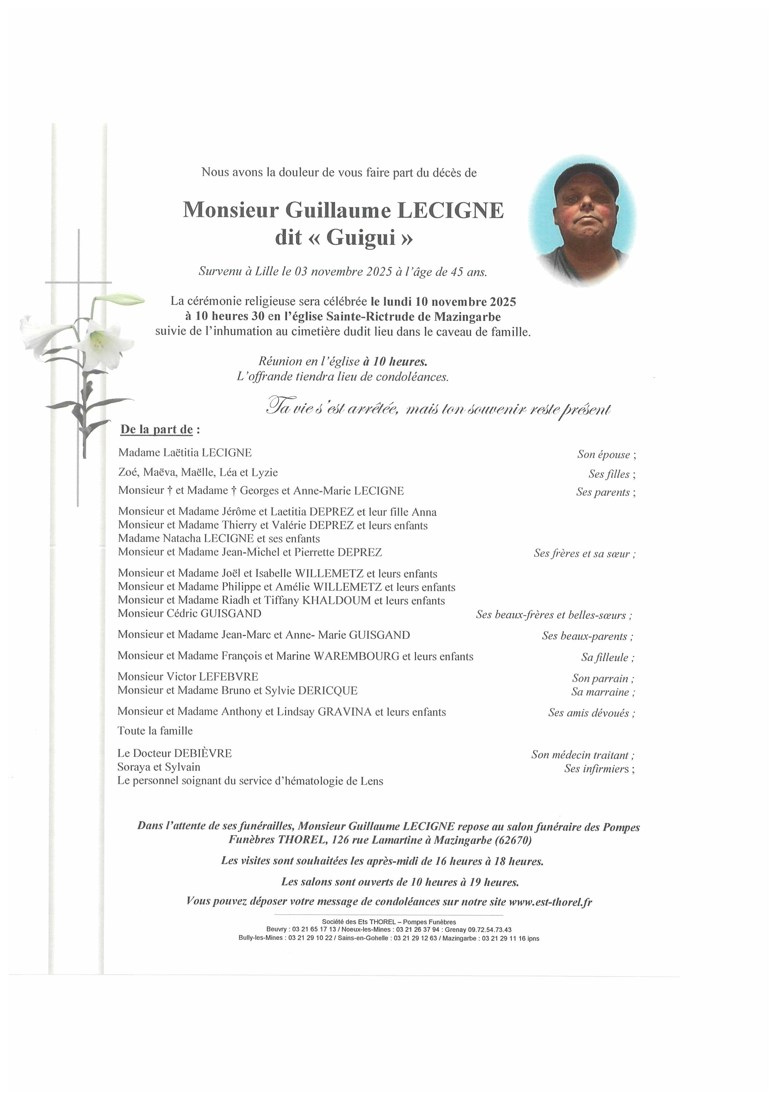 C’est avec une grande tristesse que nous vous annonçons le décès de Guillaume LECIGNE survenu le lundi 03 novembre 2025 à Lille.