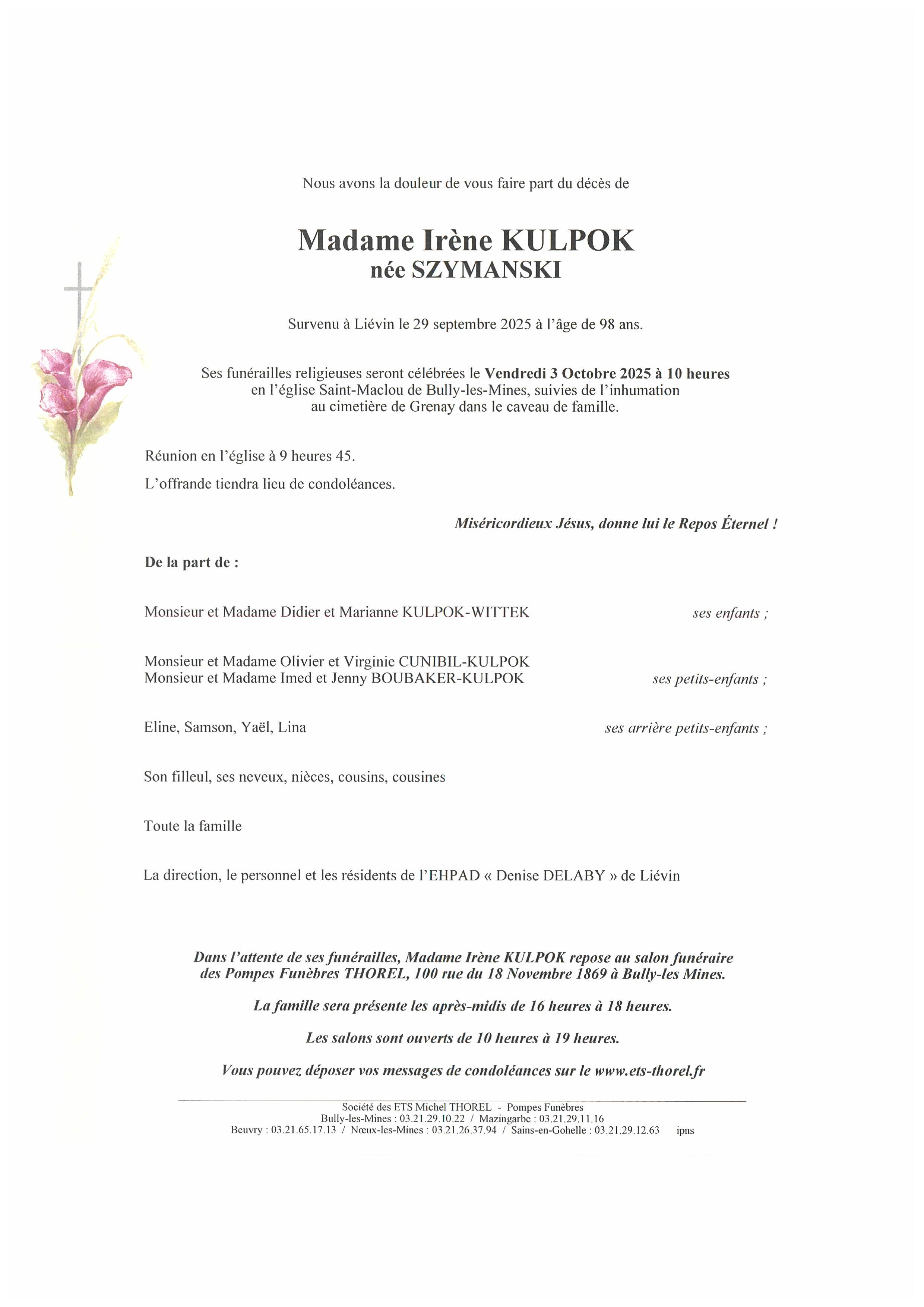 C’est avec une grande tristesse que nous vous annonçons le décès d’Irène KULPOK survenu le lundi 29 septembre 2025 à Liévin. La cérémonie se déroulera le vendredi 03 octobre 2025 à 10h00 à l’adresse suivante : Église Saint Maclou - 11 Rue Ernest Renan - 62160 Bully-les-Mines.
