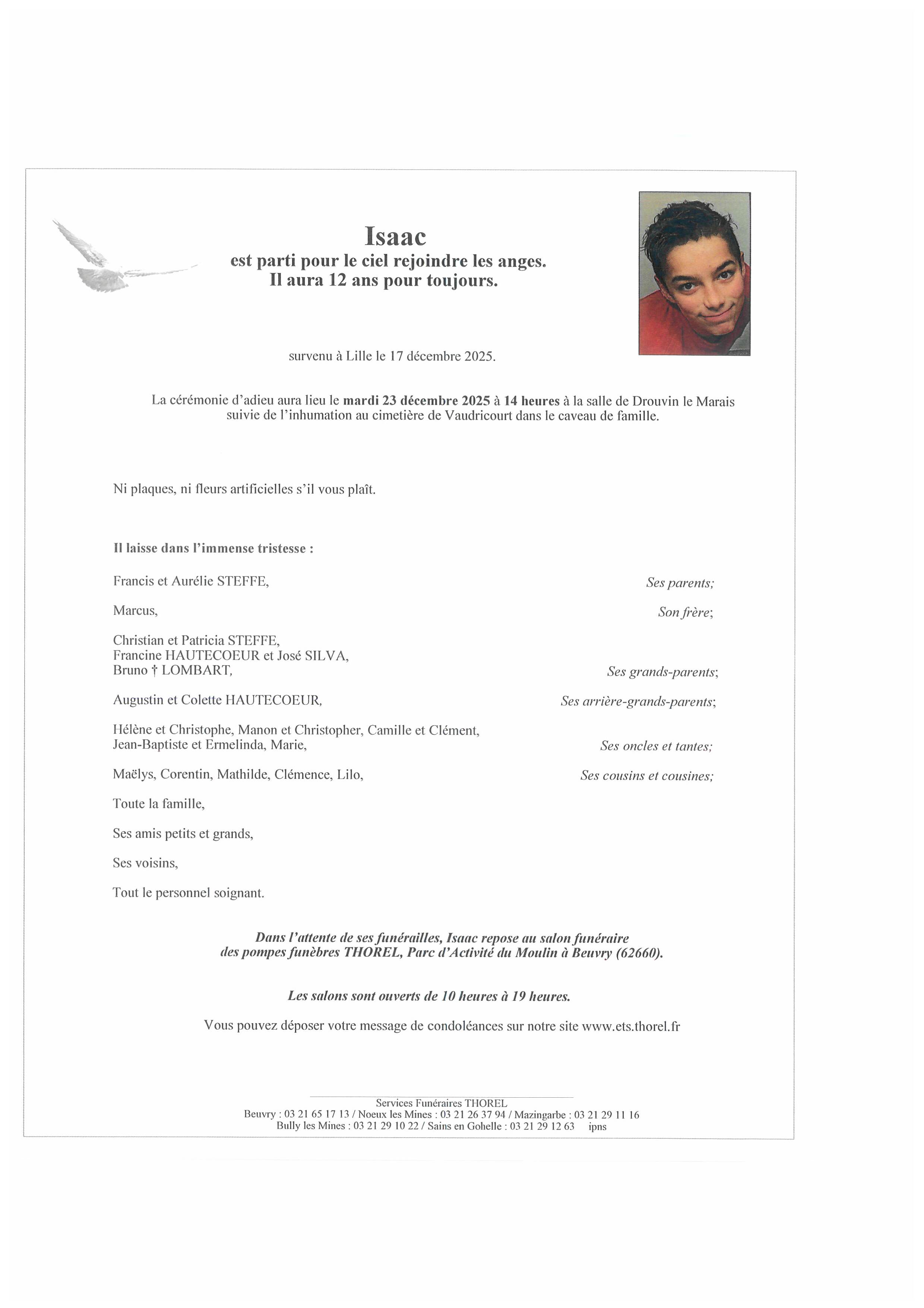 C’est avec une grande tristesse que nous vous annonçons le décès d’Issac STEFFE survenu le mercredi 17 décembre 2025 à Lille. La cérémonie se déroulera le mardi 23 décembre 2025 à 15h00 à l’adresse suivante : Cimetière de Vaudricourt - 149, Rue du Courant d'Eau - 62131 Vaudricourt.
