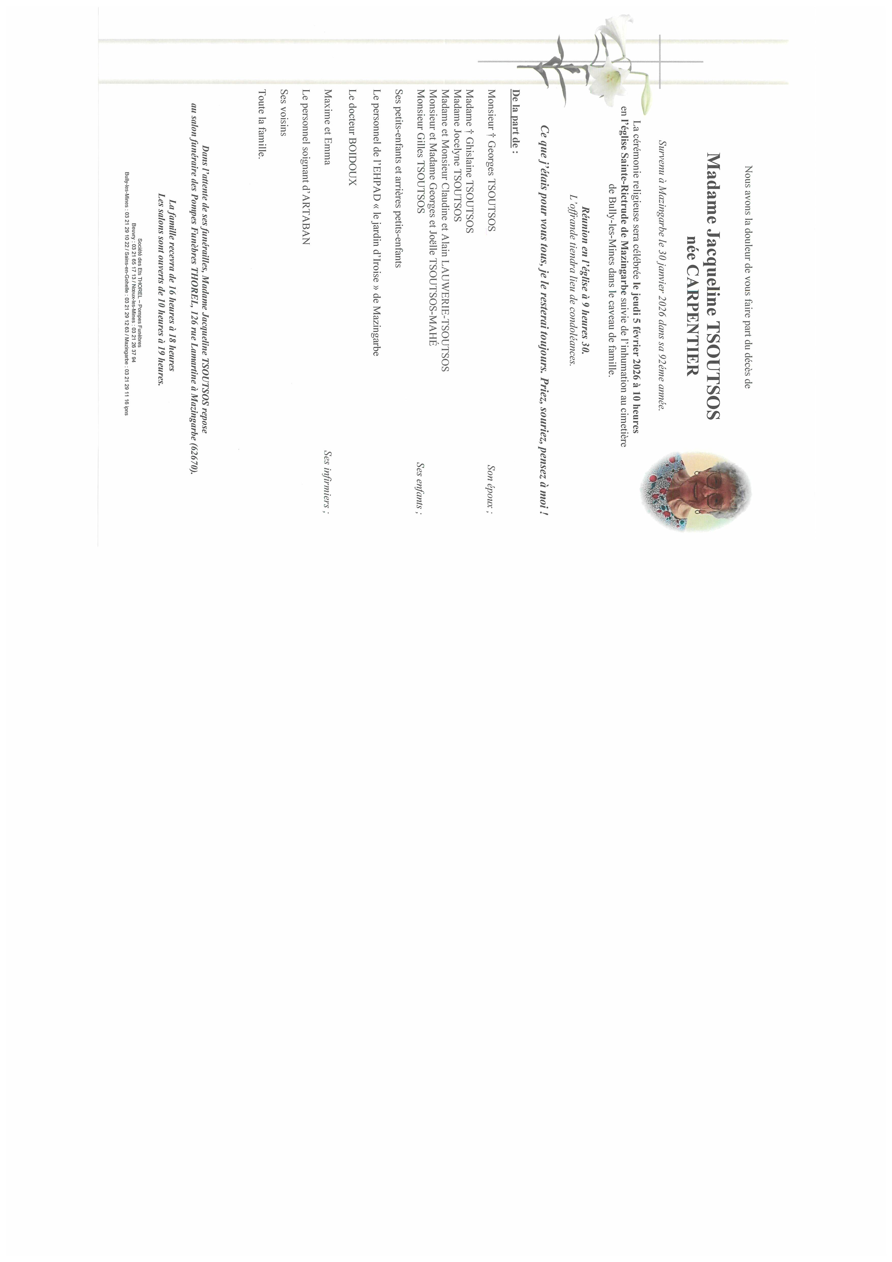 C’est avec une grande tristesse que nous vous annonçons le décès de Jacqueline TSOUTSOS survenu le vendredi 30 janvier 2026 à Mazingarbe. La cérémonie se déroulera le jeudi 05 février 2026 à 10h00 à l’adresse suivante : Église Catholique Sainte-Rictrude - Rue Alphonse Decatoire - 62670 Mazingarbe.