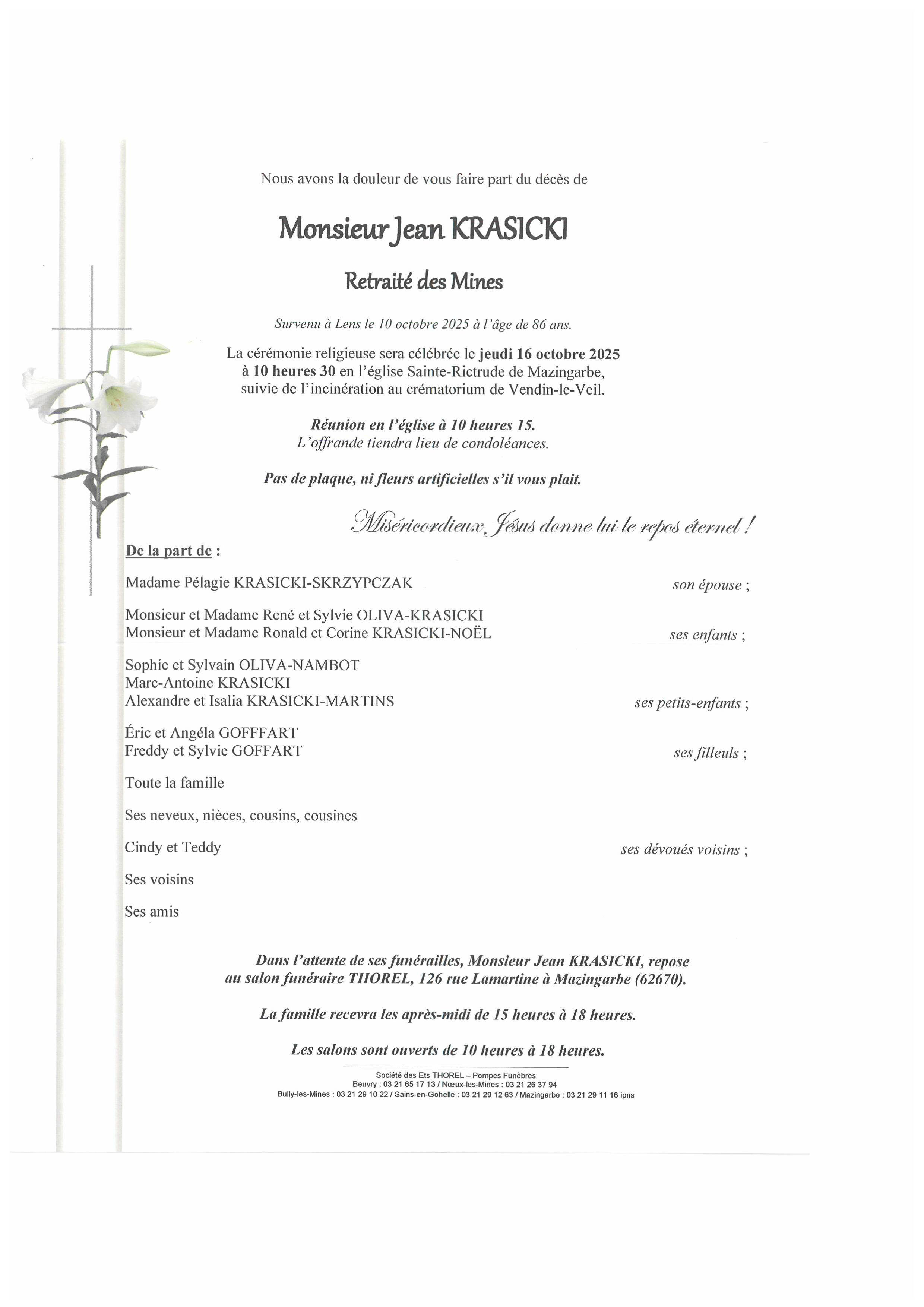 C’est avec une grande tristesse que nous vous annonçons le décès de Jean KRASICKI survenu le vendredi 10 octobre 2025 à Lens. La cérémonie se déroulera le jeudi 16 octobre 2025 à 10h15 à l’adresse suivante : Église Catholique Sainte-Rictrude - Rue Alphonse Decatoire - 62670 Mazingarbe.