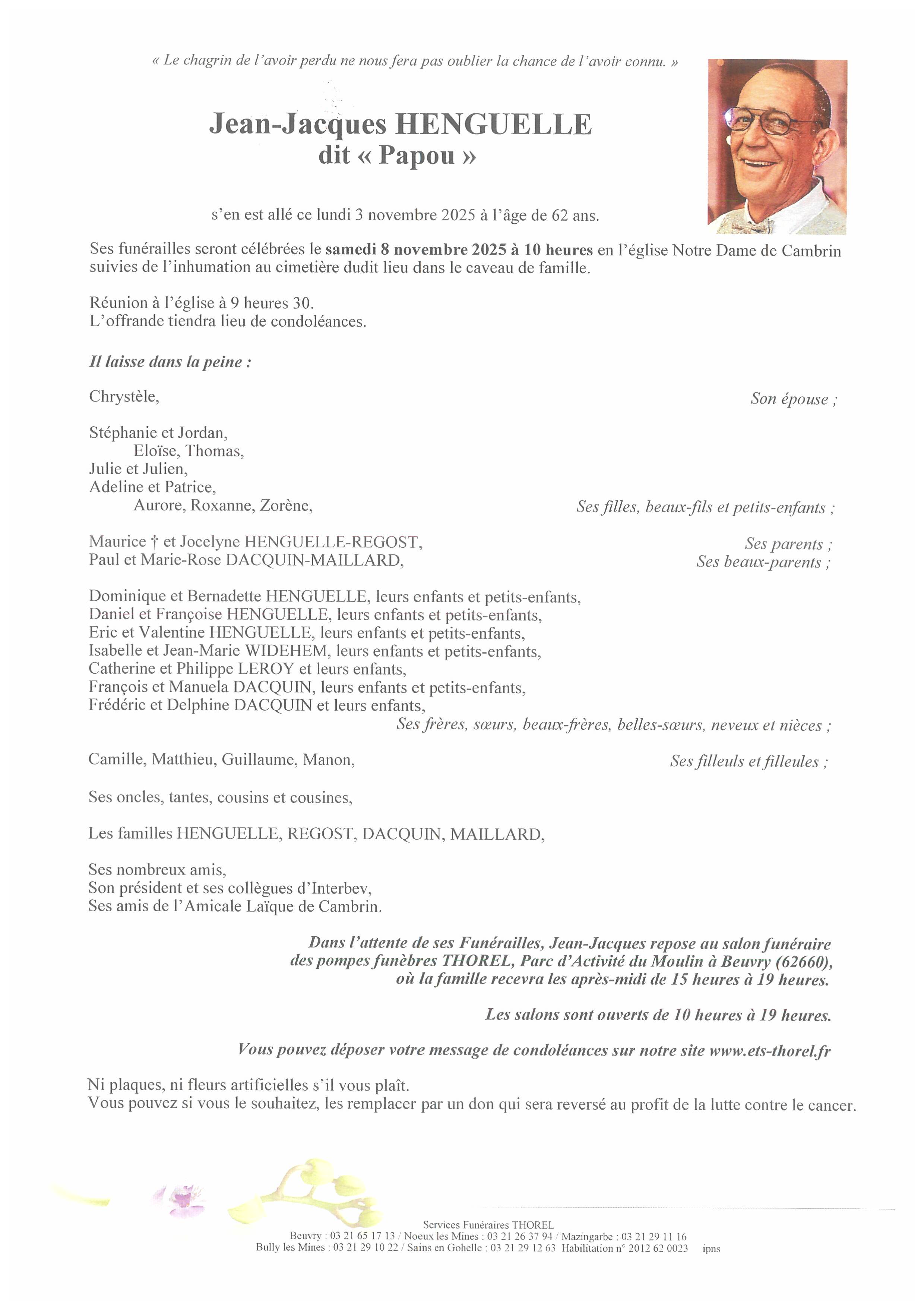 C’est avec une grande tristesse que nous vous annonçons le décès de Jean-Jacques HENGUELLE survenu le lundi 03 novembre 2025.