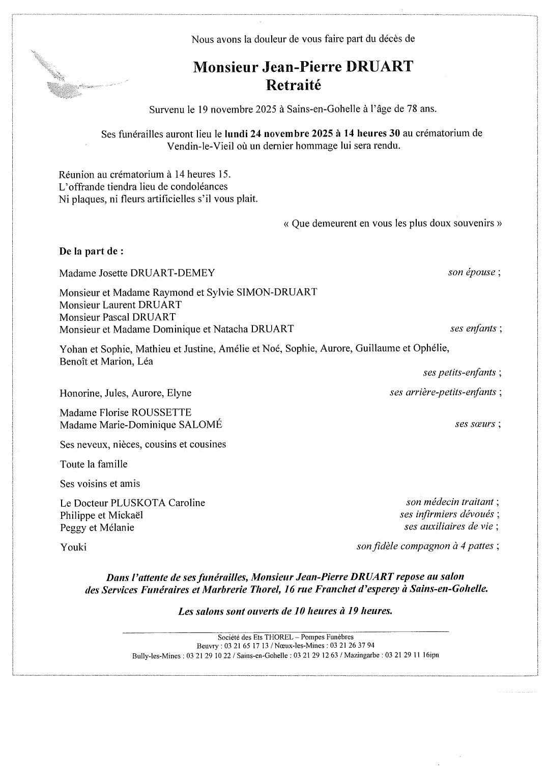 C’est avec une grande tristesse que nous vous annonçons le décès de Jean-Pierre DRUART survenu le mercredi 19 novembre 2025 à Sains-en-Gohelle.