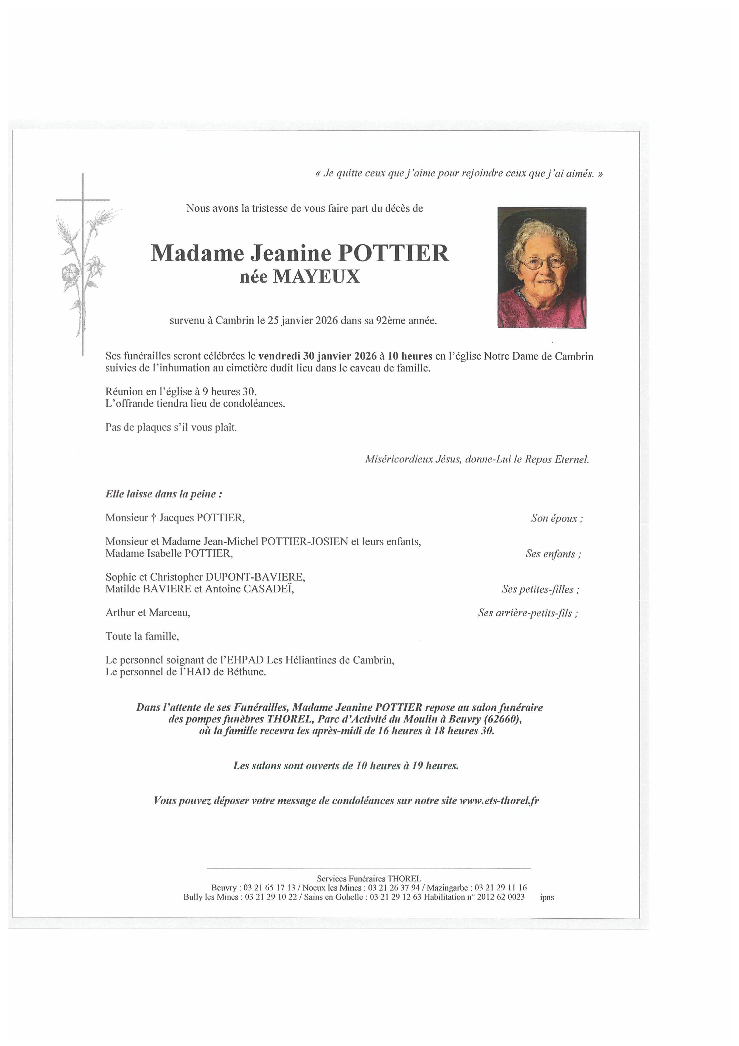 C’est avec une grande tristesse que nous vous annonçons le décès de Jeanine POTTIER survenu le dimanche 25 janvier 2026 à Cambrin.