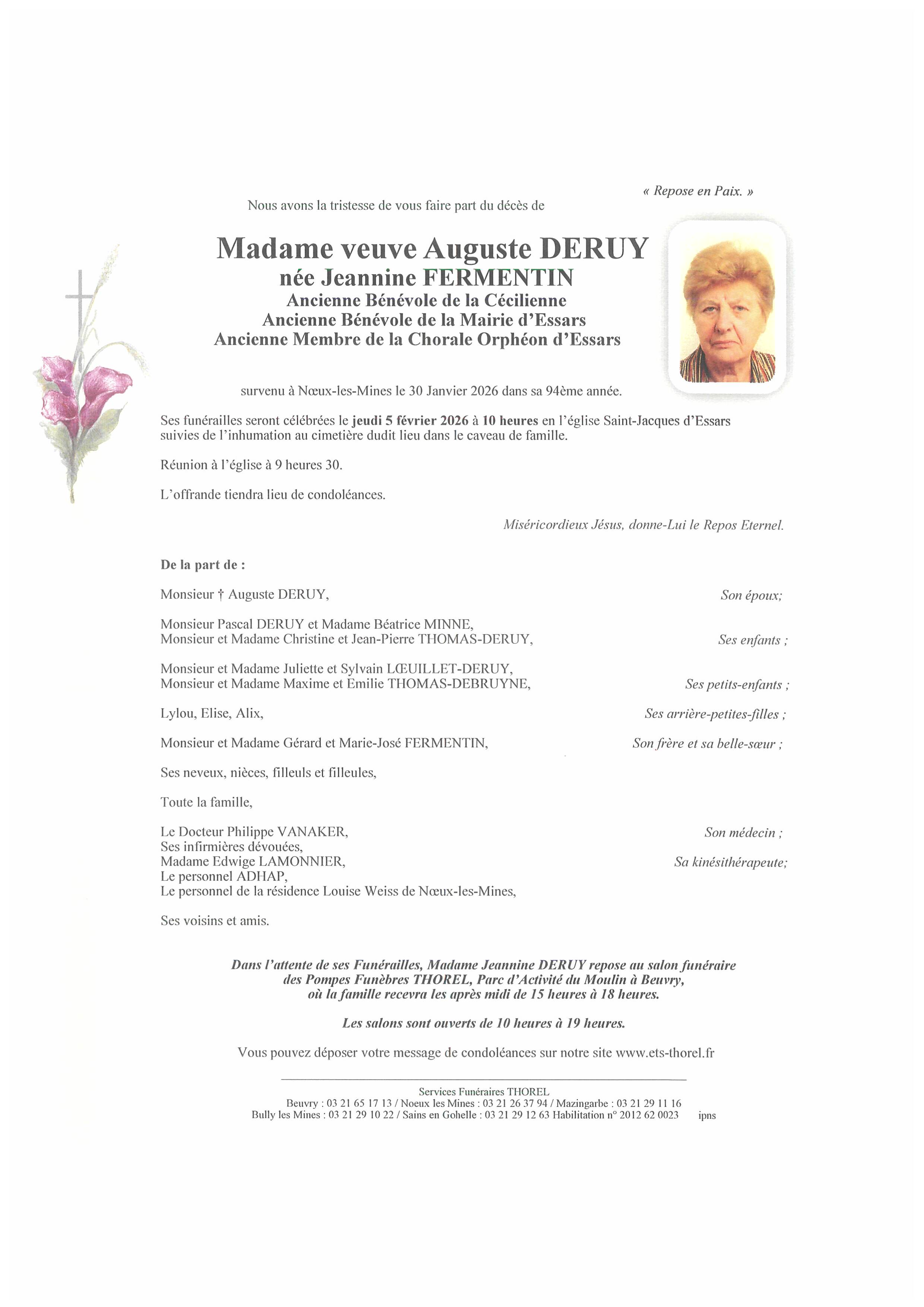 C’est avec une grande tristesse que nous vous annonçons le décès de Jeannine DERUY survenu le vendredi 30 janvier 2026 à Noeux-les-Mines.