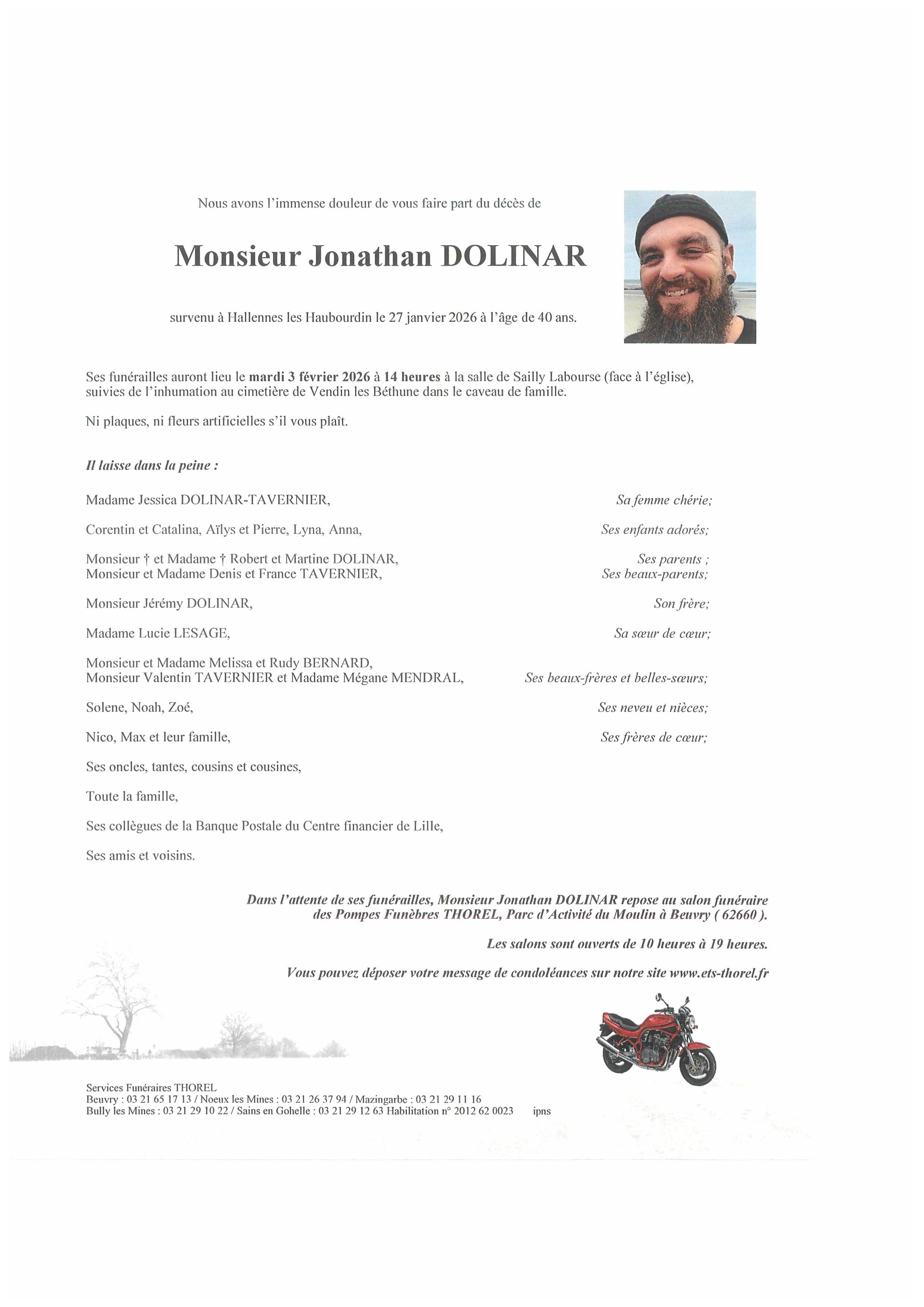 C’est avec une grande tristesse que nous vous annonçons le décès de Jonathan DOLINAR survenu le mardi 27 janvier 2026 à Hallennes lez Haubourdin. La cérémonie se déroulera le mardi 03 février 2026 à 14h00 à l’adresse suivante : .