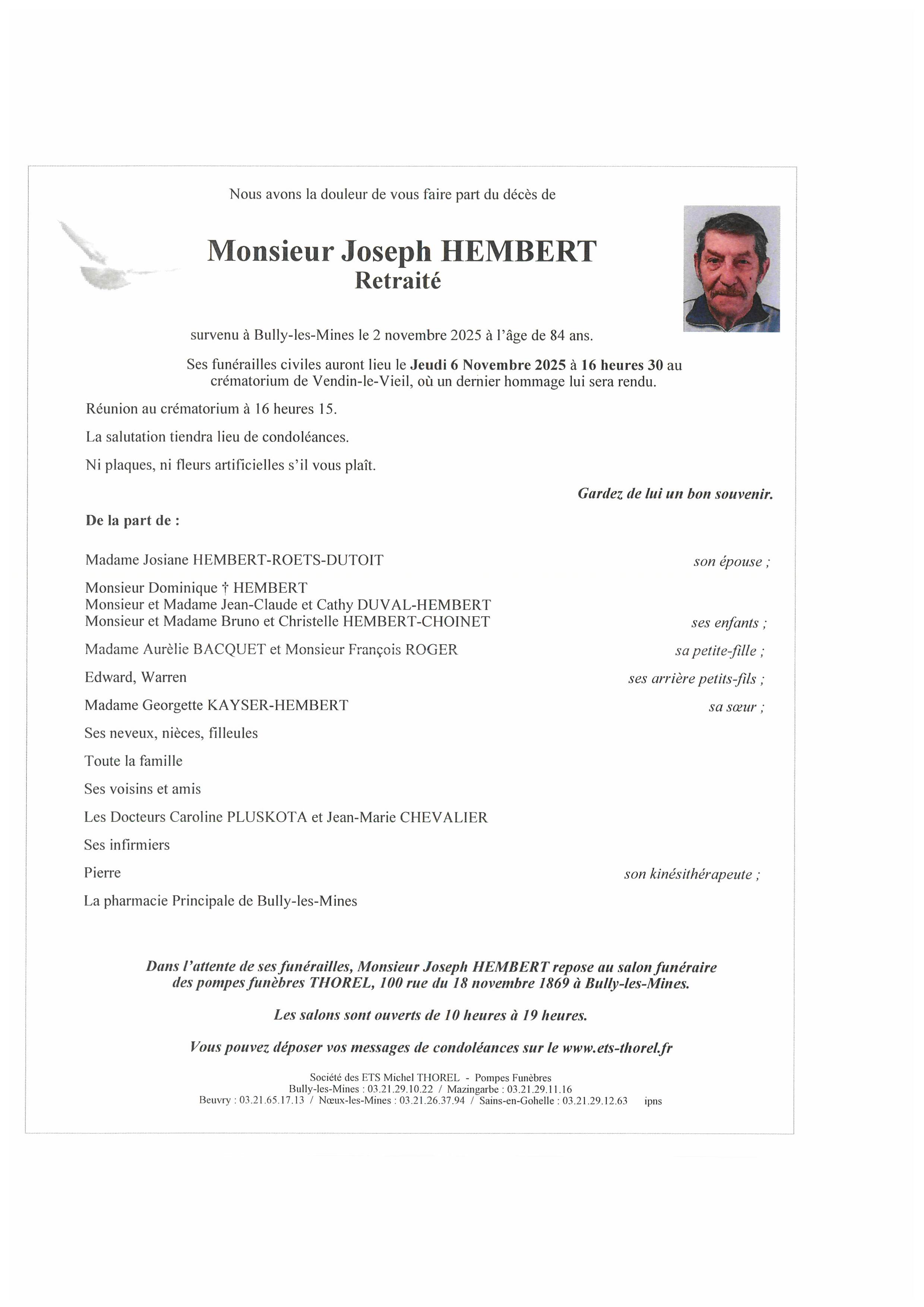 C’est avec une grande tristesse que nous vous annonçons le décès de Joseph HEMBERT survenu le dimanche 02 novembre 2025 à Bully-les-Mines.