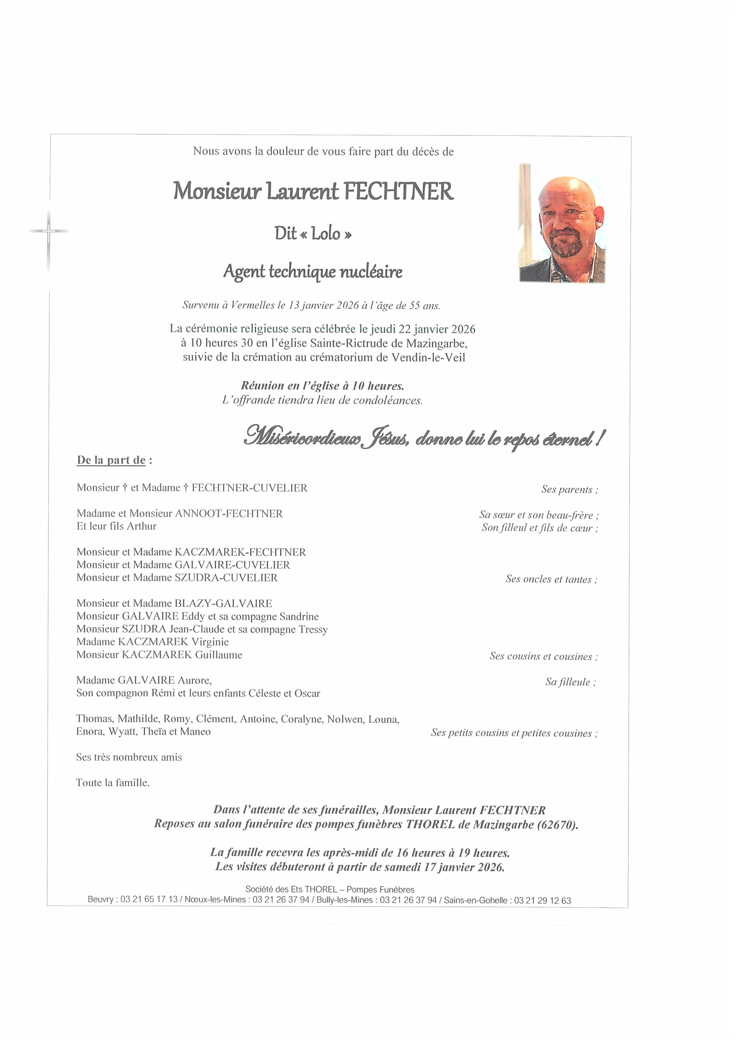 C’est avec une grande tristesse que nous vous annonçons le décès de Laurent FECHTNER survenu le mardi 13 janvier 2026 à Vermelles.