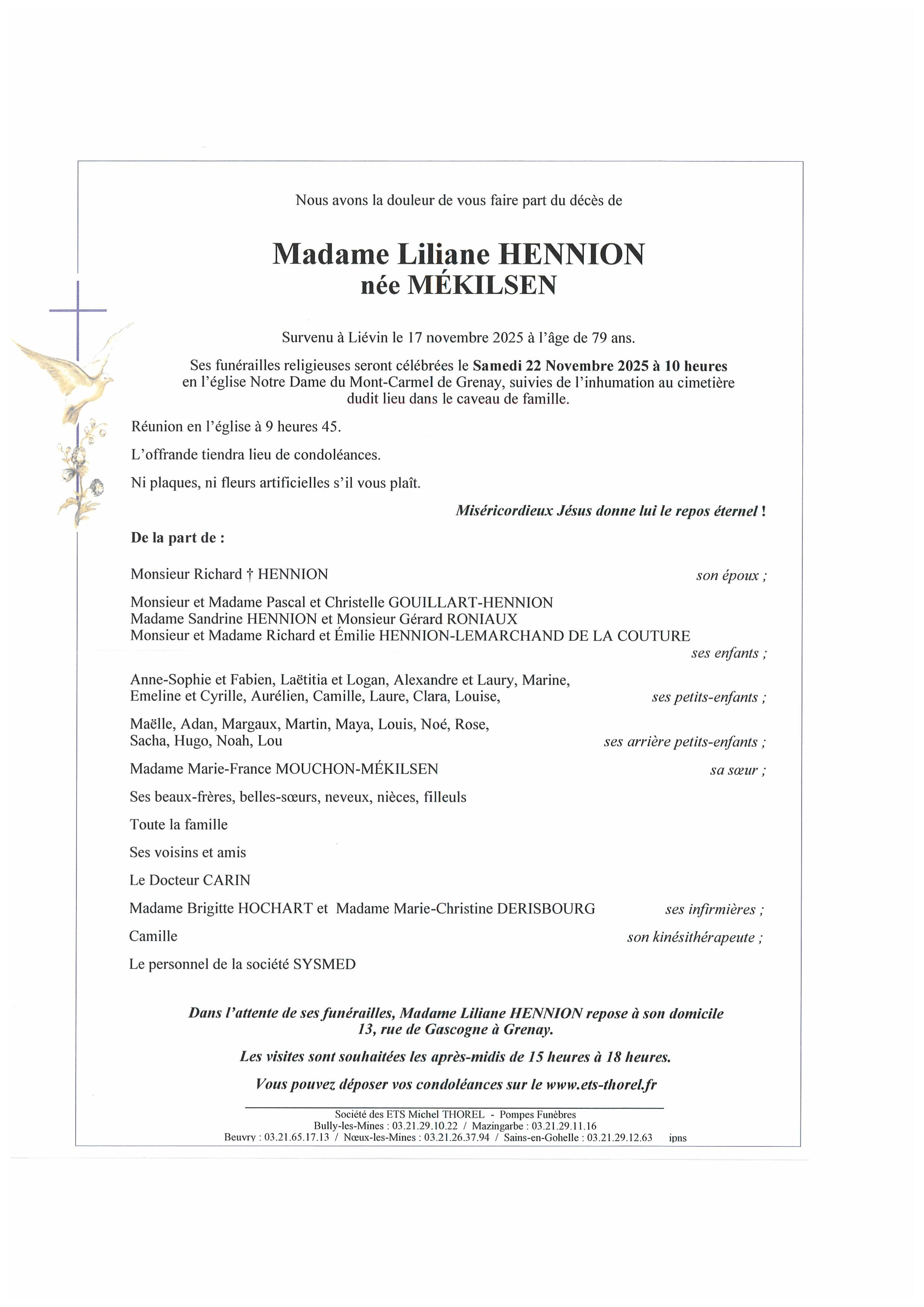 C’est avec une grande tristesse que nous vous annonçons le décès de Liliane HENNION survenu le lundi 17 novembre 2025 à Liévin. La cérémonie se déroulera le samedi 22 novembre 2025 à 10h00 à l’adresse suivante : Église Notre Dame du Mont Carmel - Rue Beaucamp (Centre Ville) - 62160 Grenay.