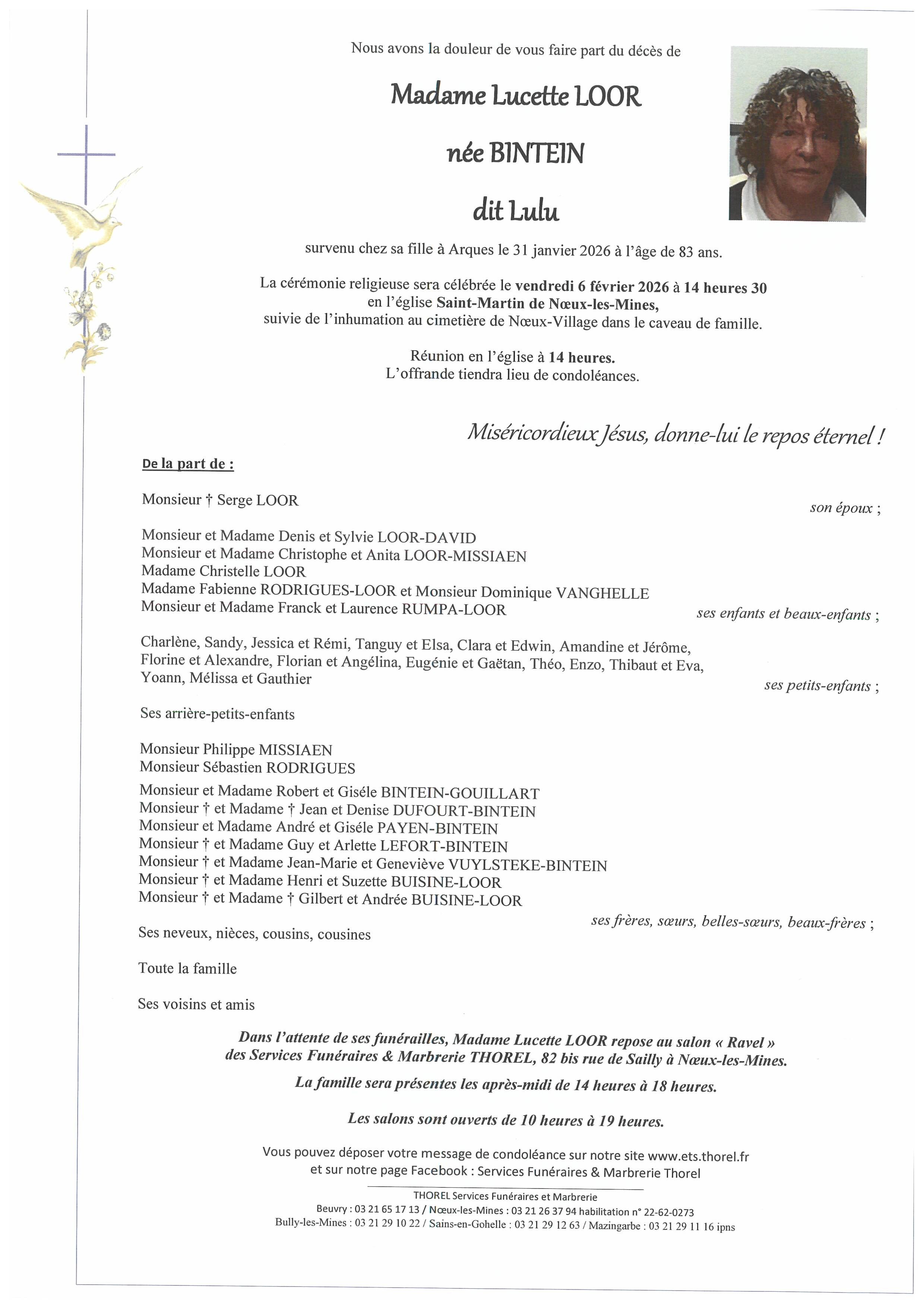 C’est avec une grande tristesse que nous vous annonçons le décès de Lucette LOOR survenu le samedi 31 janvier 2026 à Arques. La cérémonie se déroulera le vendredi 06 février 2026 à 14h00 à l’adresse suivante : Église Saint Martin - rue du Presbytère - 62290 Noeux-les-Mines.