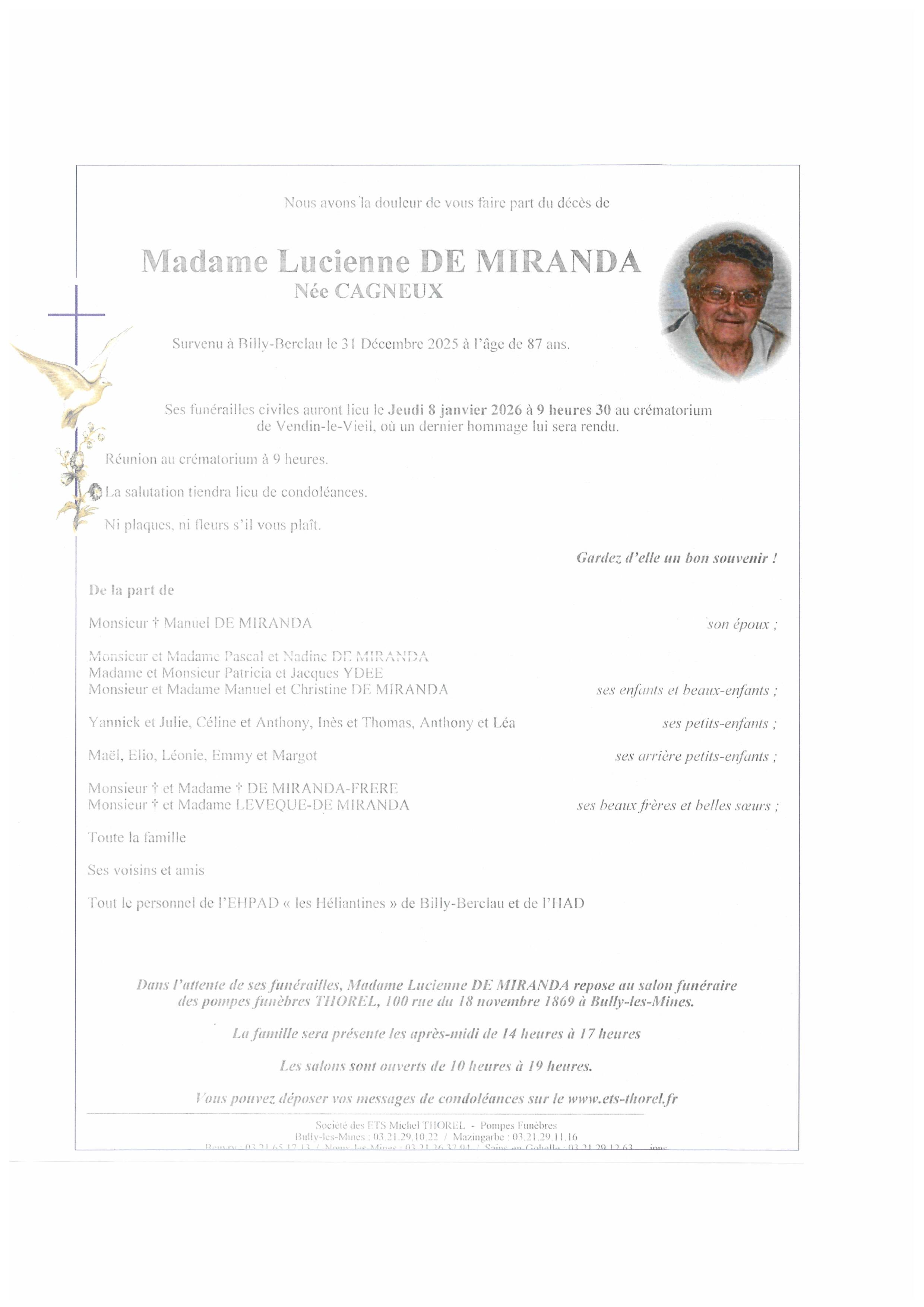 C’est avec une grande tristesse que nous vous annonçons le décès de Lucienne DE MIRANDA survenu le mercredi 31 décembre 2025 à Billy Berclau.