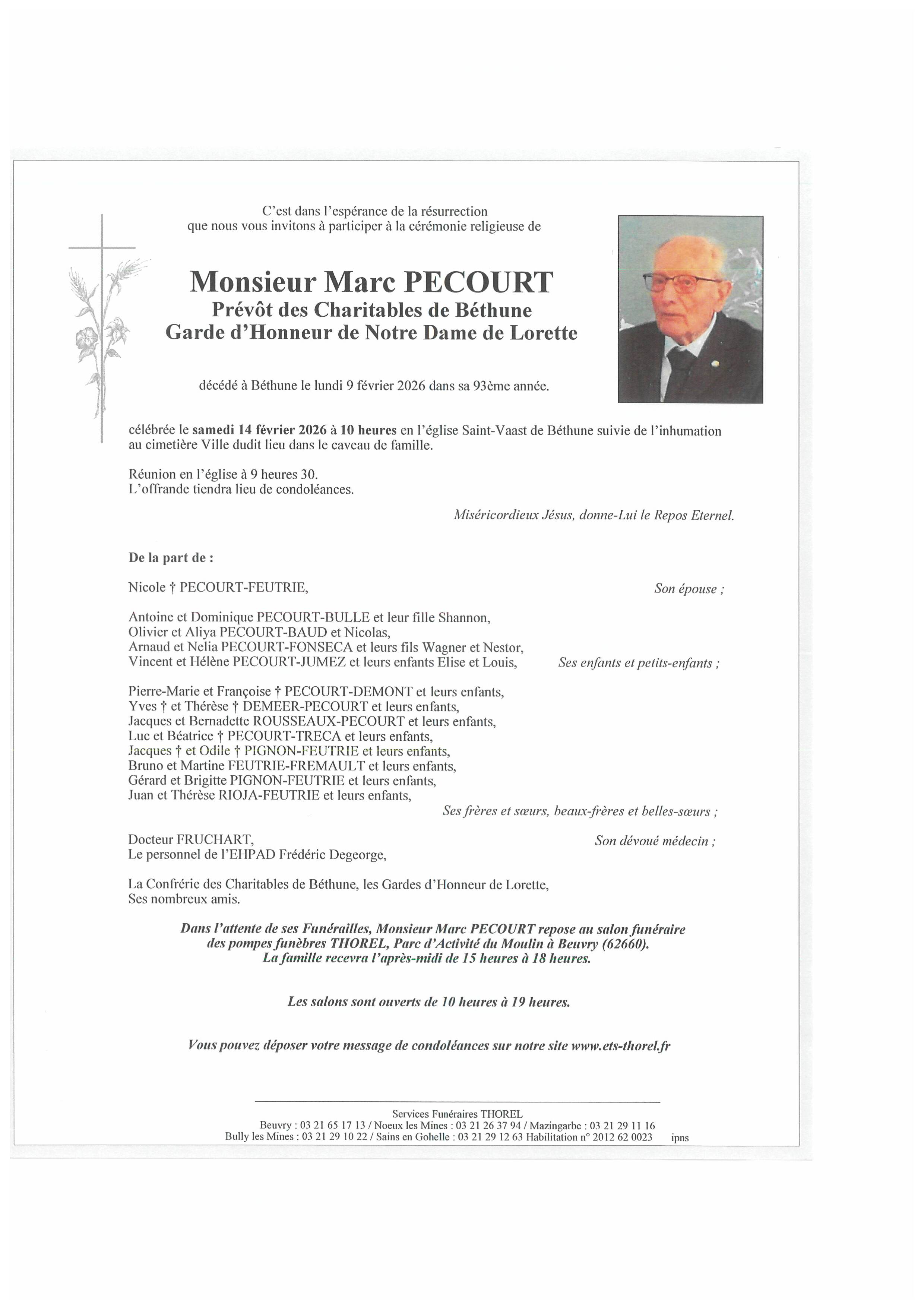 C’est avec une grande tristesse que nous vous annonçons le décès de Marc PECOURT survenu le lundi 09 février 2026 à Bethune. La cérémonie se déroulera le samedi 14 février 2026 à 10h00 à l’adresse suivante : Église Saint Vaast - Place Saint-Vaast Béthune - 62400 Béthune.