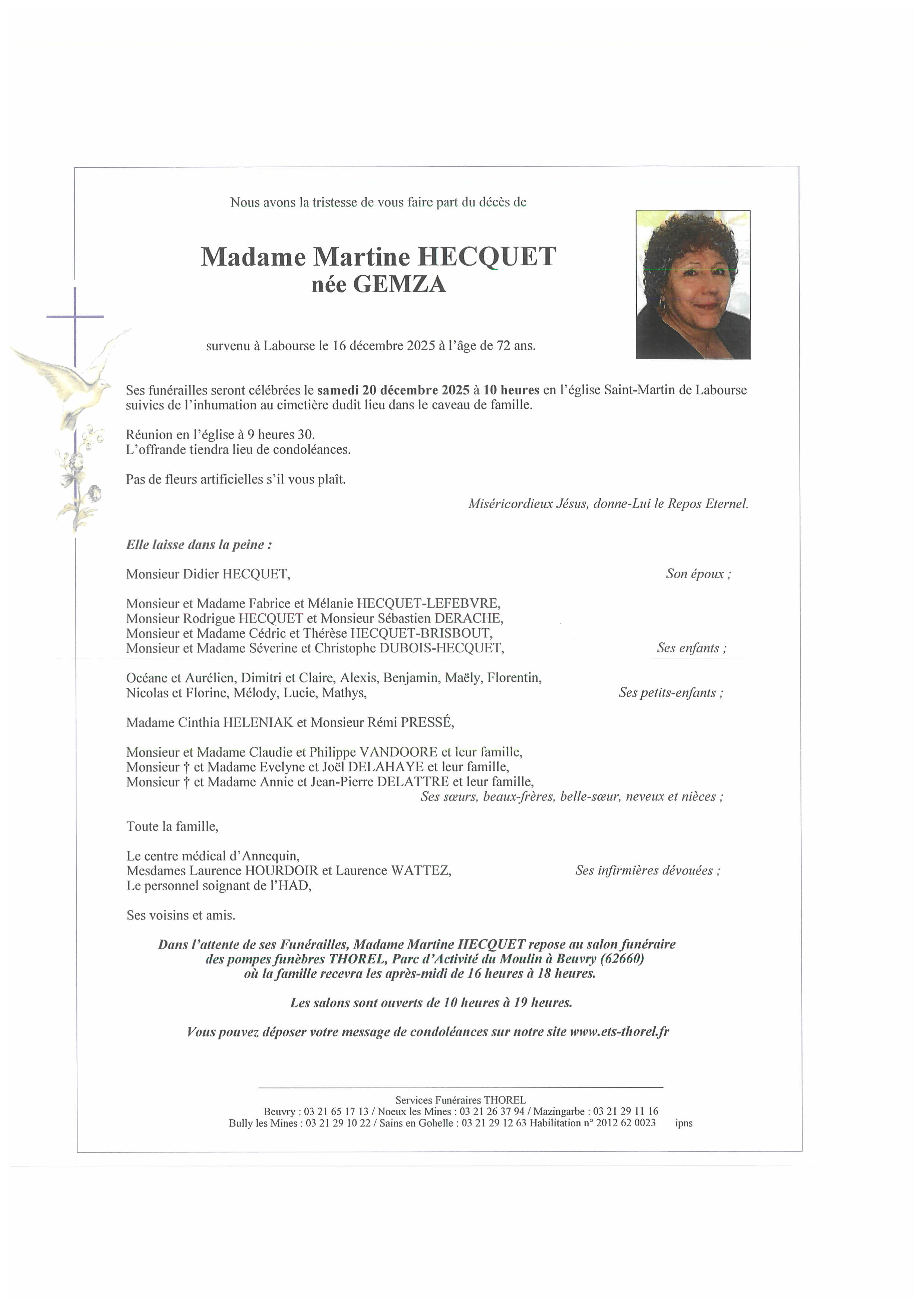 C’est avec une grande tristesse que nous vous annonçons le décès de Martine HECQUET survenu le mardi 16 décembre 2025 à Labourse. La cérémonie se déroulera le samedi 20 décembre 2025 à 10h00 à l’adresse suivante : Église Saint Martin - Route de Noeux - 62113 Labourse.