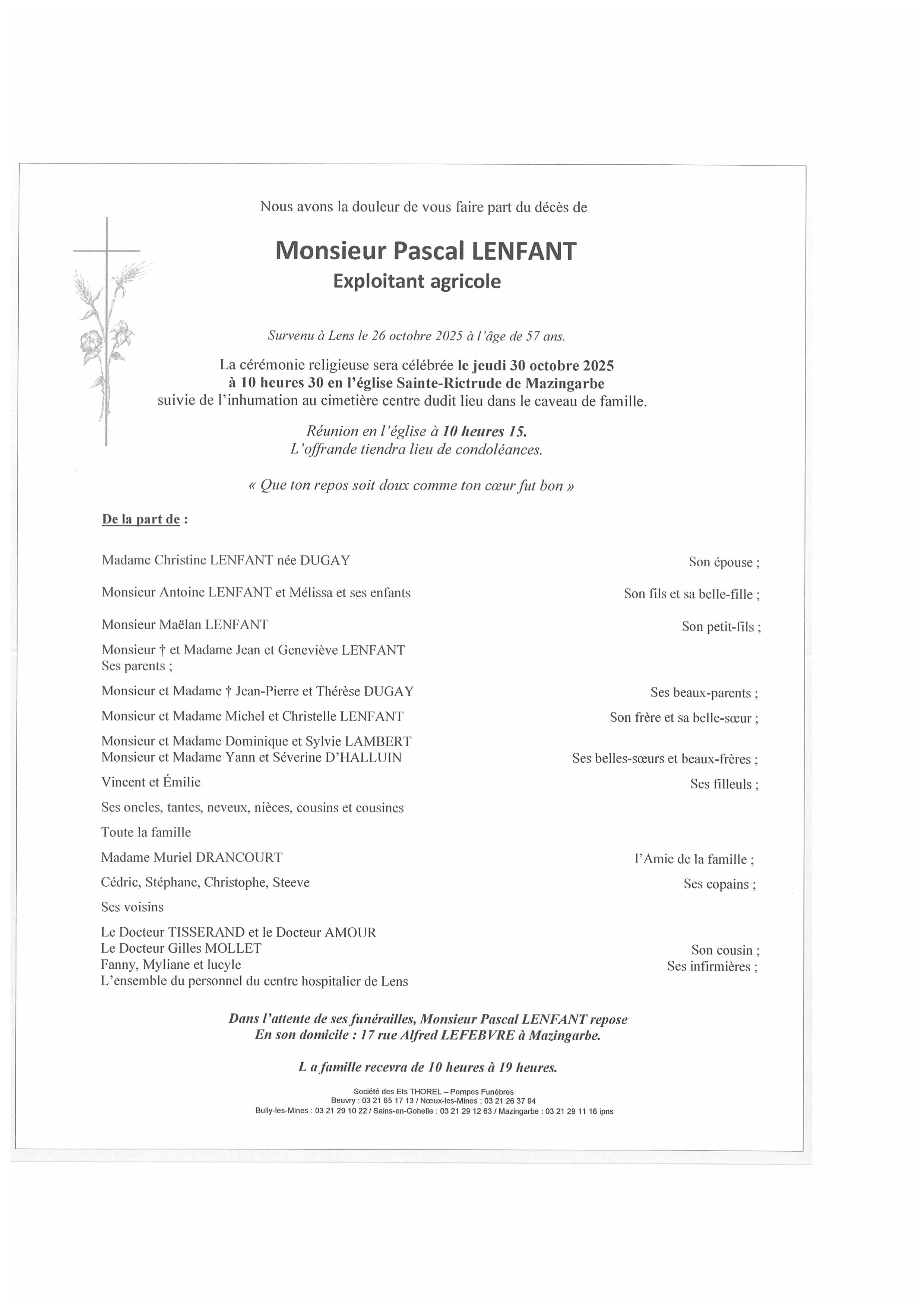 C’est avec une grande tristesse que nous vous annonçons le décès de Pascal LENFANT survenu le dimanche 26 octobre 2025 à Lens. La cérémonie se déroulera le jeudi 30 octobre 2025 à 10h30 à l’adresse suivante : Église Catholique Sainte-Rictrude - Rue Alphonse Decatoire - 62670 Mazingarbe.