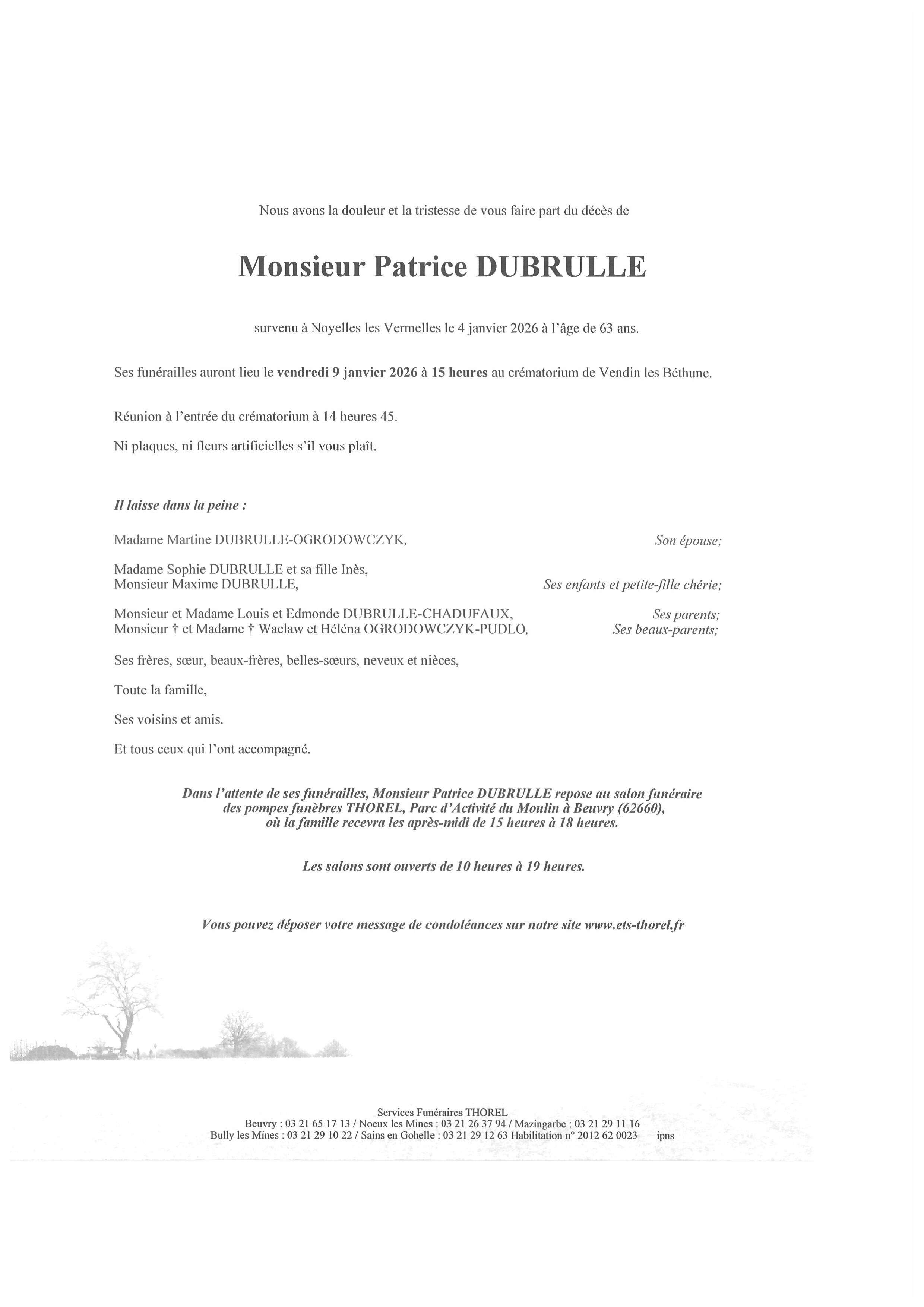 C’est avec une grande tristesse que nous vous annonçons le décès de Patrice DUBRULLE survenu le dimanche 04 janvier 2026 à Noyelles les Vermelles.