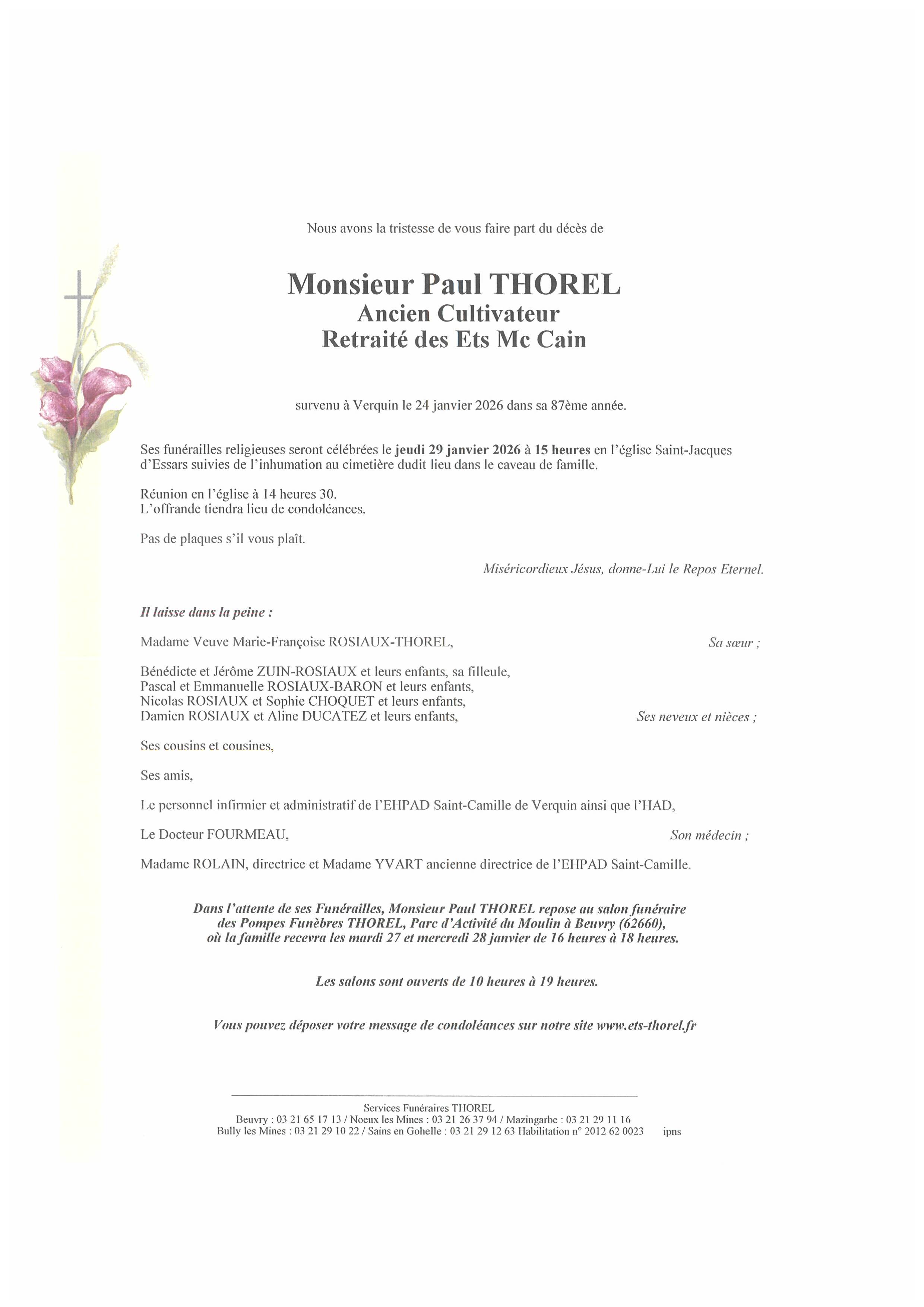 C’est avec une grande tristesse que nous vous annonçons le décès de Paul THOREL survenu le samedi 24 janvier 2026 à Verquin. La cérémonie se déroulera le jeudi 29 janvier 2026 à 15h00 à l’adresse suivante : Église Saint Jacques - Rue du 11 novembre - 62400 Essars.