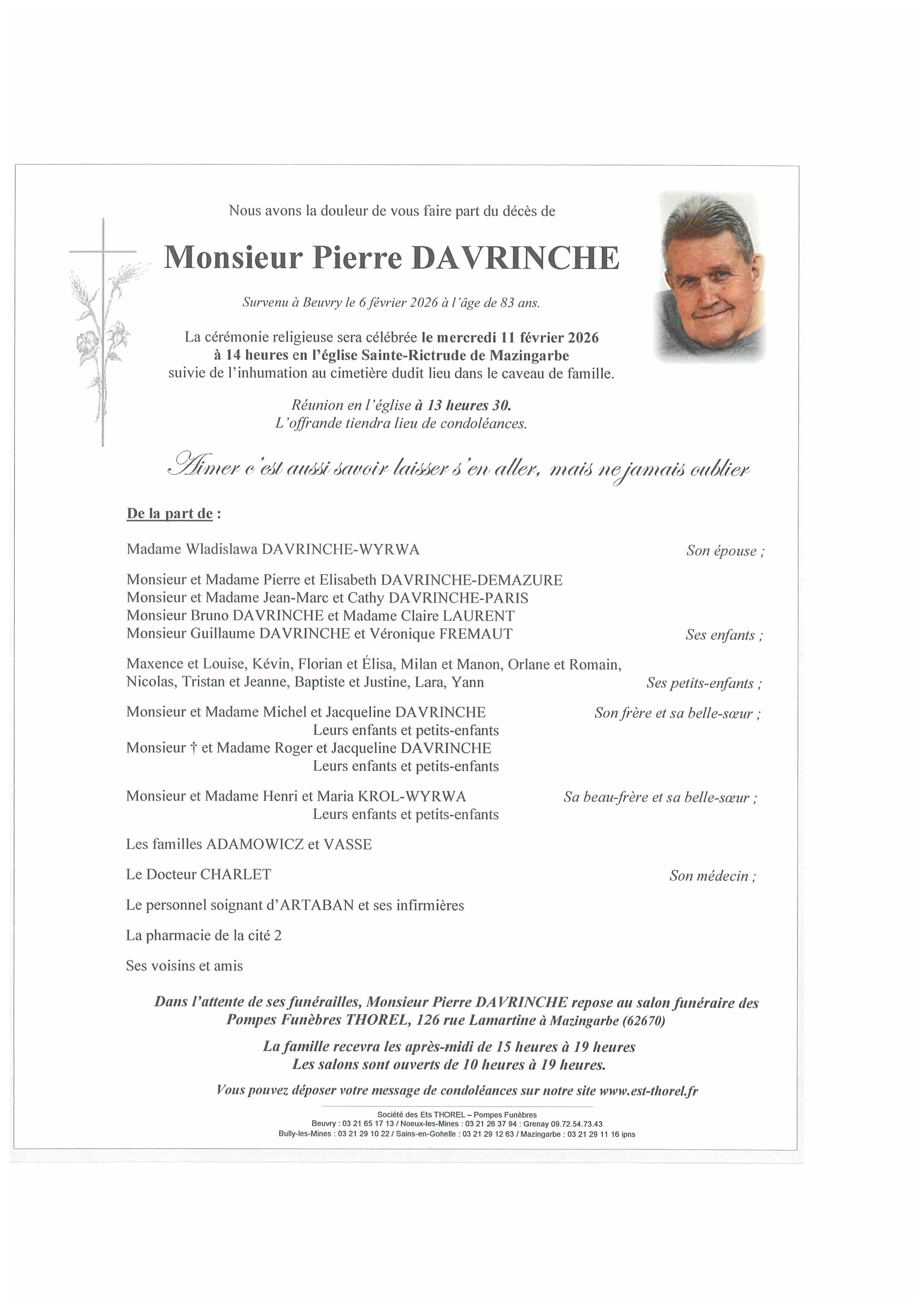 C’est avec une grande tristesse que nous vous annonçons le décès de Pierre DAVRINCHE survenu le vendredi 06 février 2026 à Beuvry. La cérémonie se déroulera le mercredi 11 février 2026 à 14h00 à l’adresse suivante : Eglise Sainte Rictrude - Rue Alphonse Decatoire - 62670 Mazingarbe.