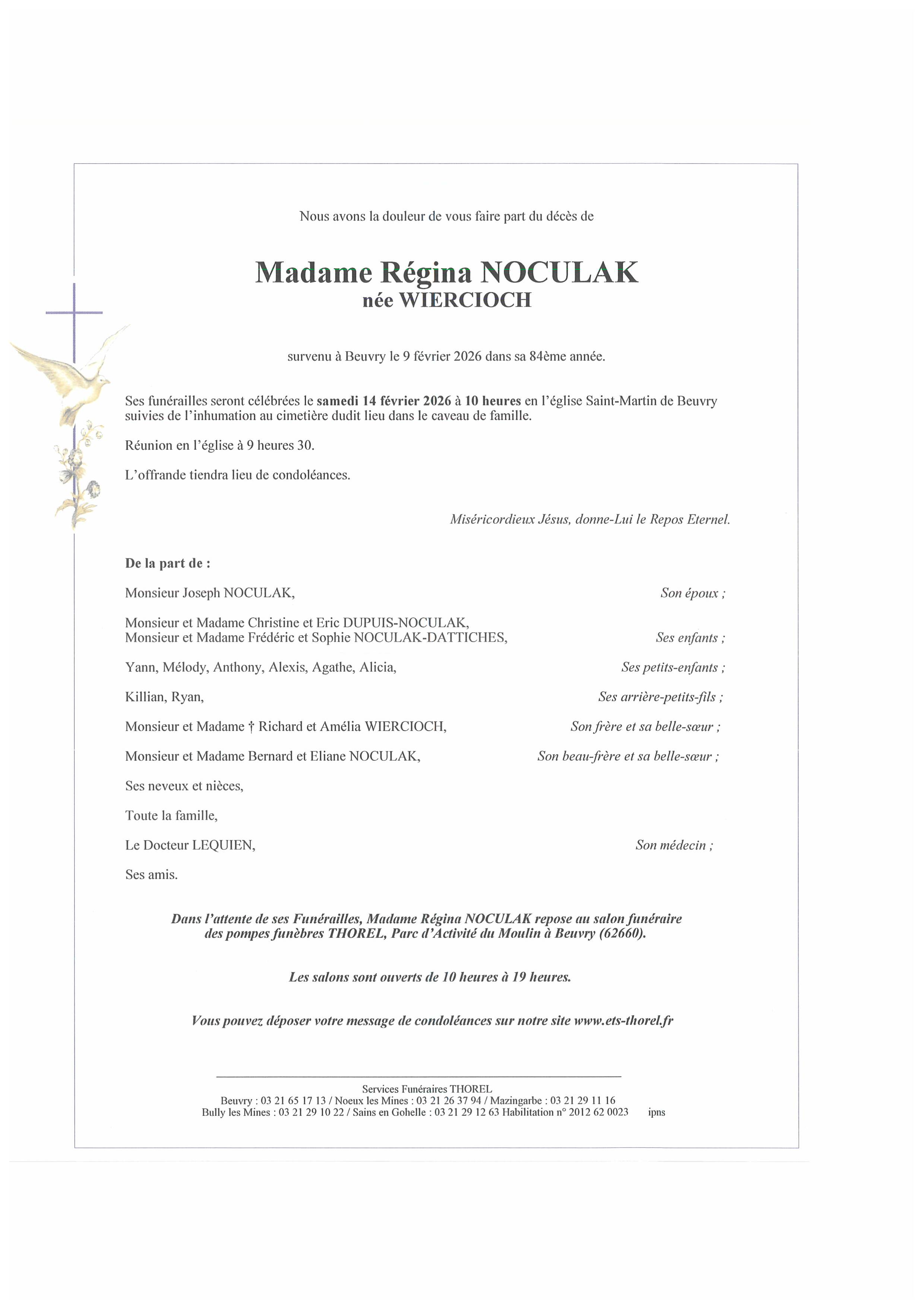C’est avec une grande tristesse que nous vous annonçons le décès de Régina NOCULAK survenu le lundi 09 février 2026 à Beuvry. La cérémonie se déroulera le samedi 14 février 2026 à 10h00 à l’adresse suivante : Église Saint Martin - Rue Sadi Carnot - 62660 Beuvry.