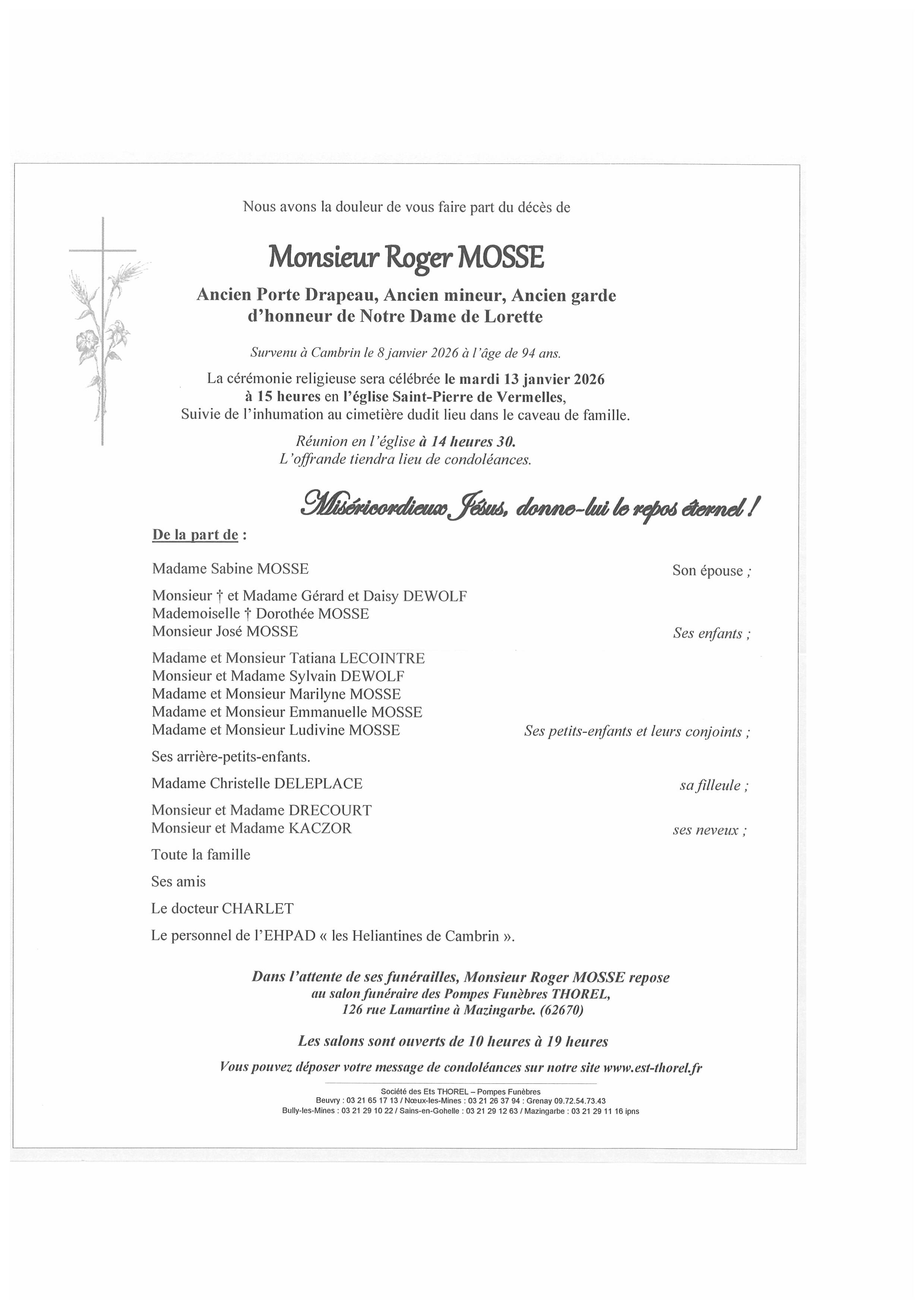 C’est avec une grande tristesse que nous vous annonçons le décès de Roger MOSSE survenu le jeudi 08 janvier 2026 à Cambrin.