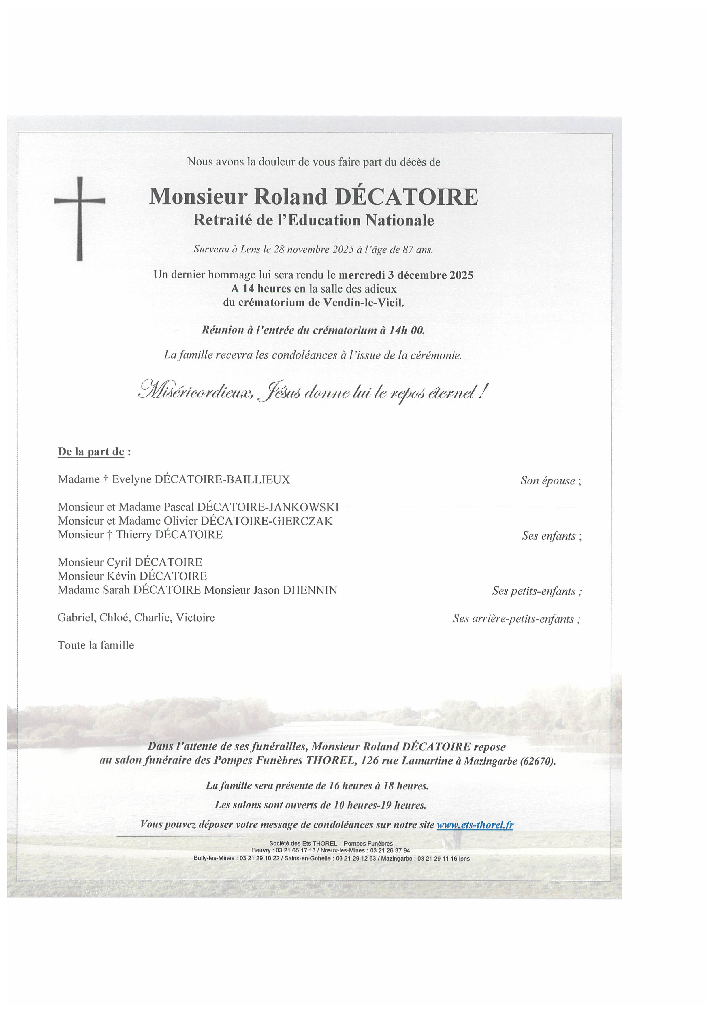 C’est avec une grande tristesse que nous vous annonçons le décès de Roland DECATOIRE survenu le vendredi 28 novembre 2025 à Lens. La cérémonie se déroulera le mercredi 03 décembre 2025 à 13h30 à l’adresse suivante : Crématorium de Vendin le Vieil - Route de la Bassée - 62880 Vendin-le-Vieil.