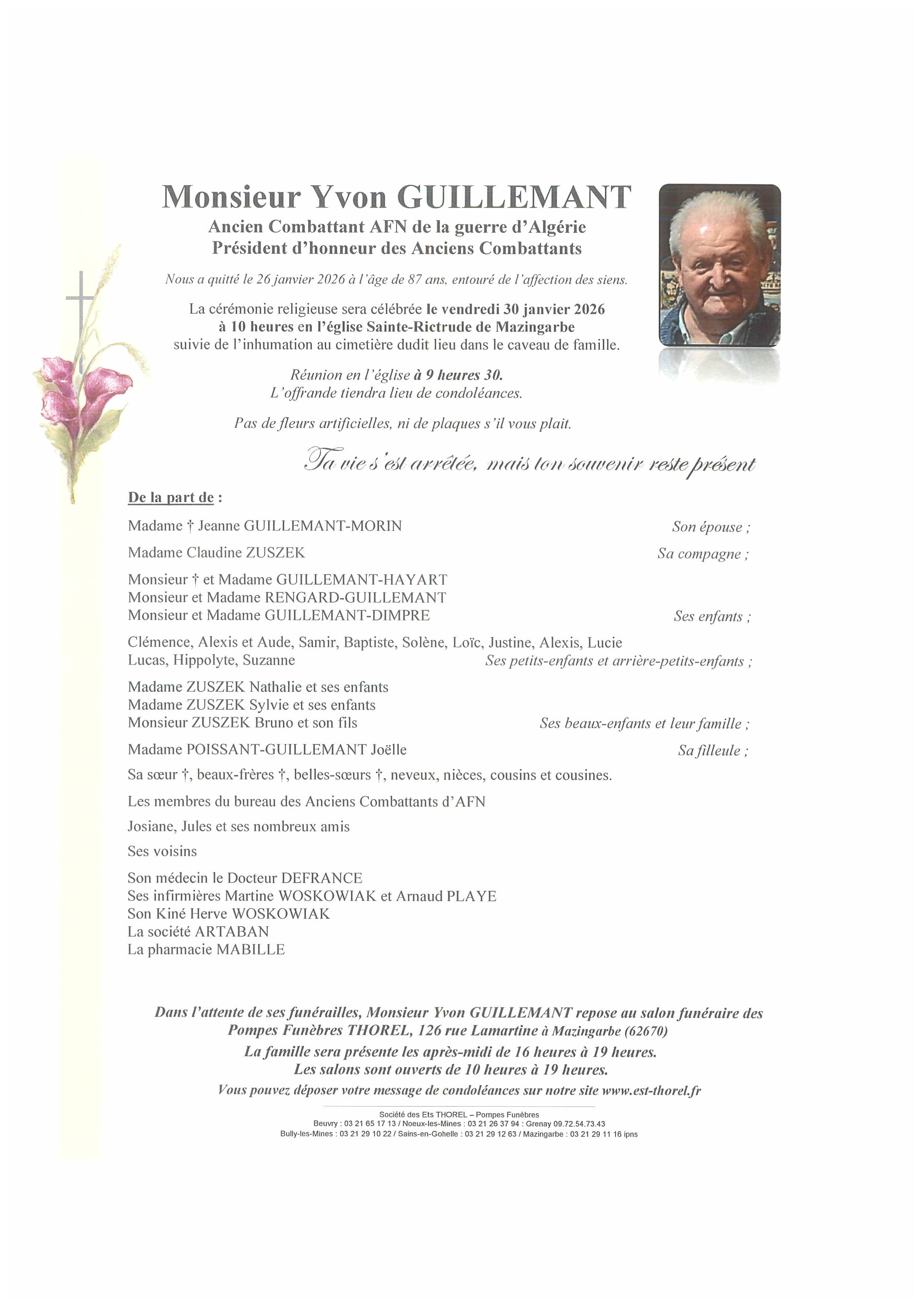 C’est avec une grande tristesse que nous vous annonçons le décès d’Yvon GUILLEMANT survenu le lundi 26 janvier 2026 à Hénin-Beaumont.